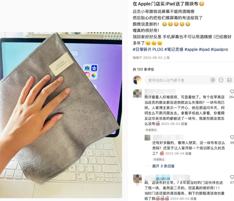 例子二,如果你的iPhone或者MacBook屏幕脏了,可以去苹果直营店免费清洁,不用买任何东西。有人去清洁和店员聊得开心,直接还送了几块3M特供苹果的清洁布,这是好东西,真羡慕。