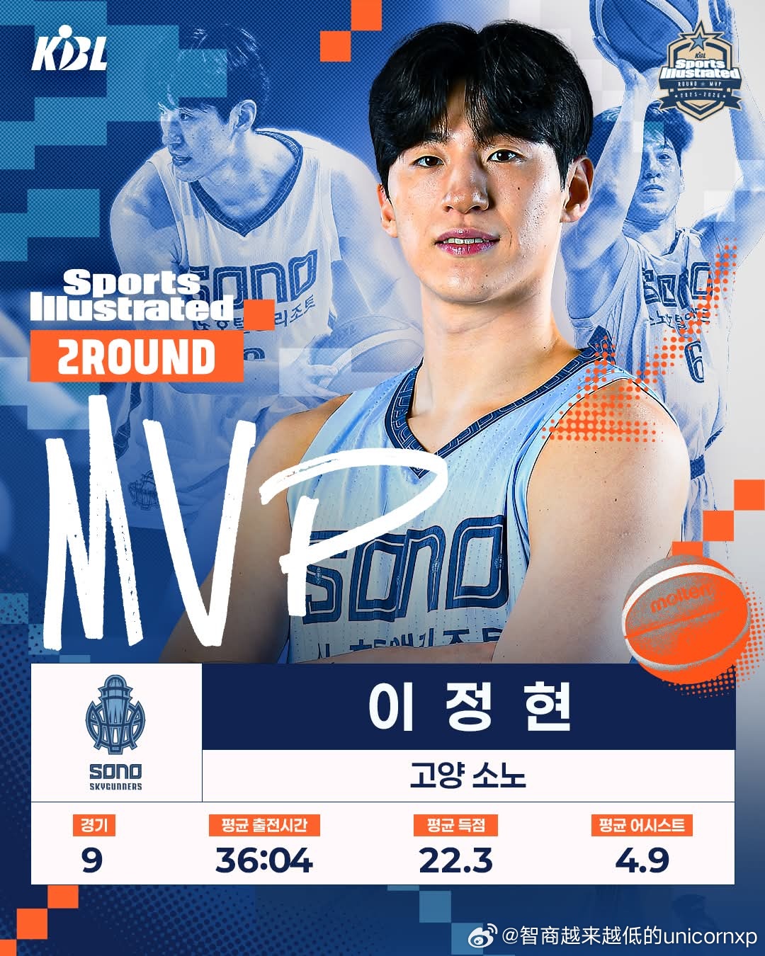 李政炫当选KBL联赛第二轮MVP。不仅在世预赛第一窗口期有出众表现,联赛最近9场比赛他场均可以得到22.3分4.8助亚洲篮球