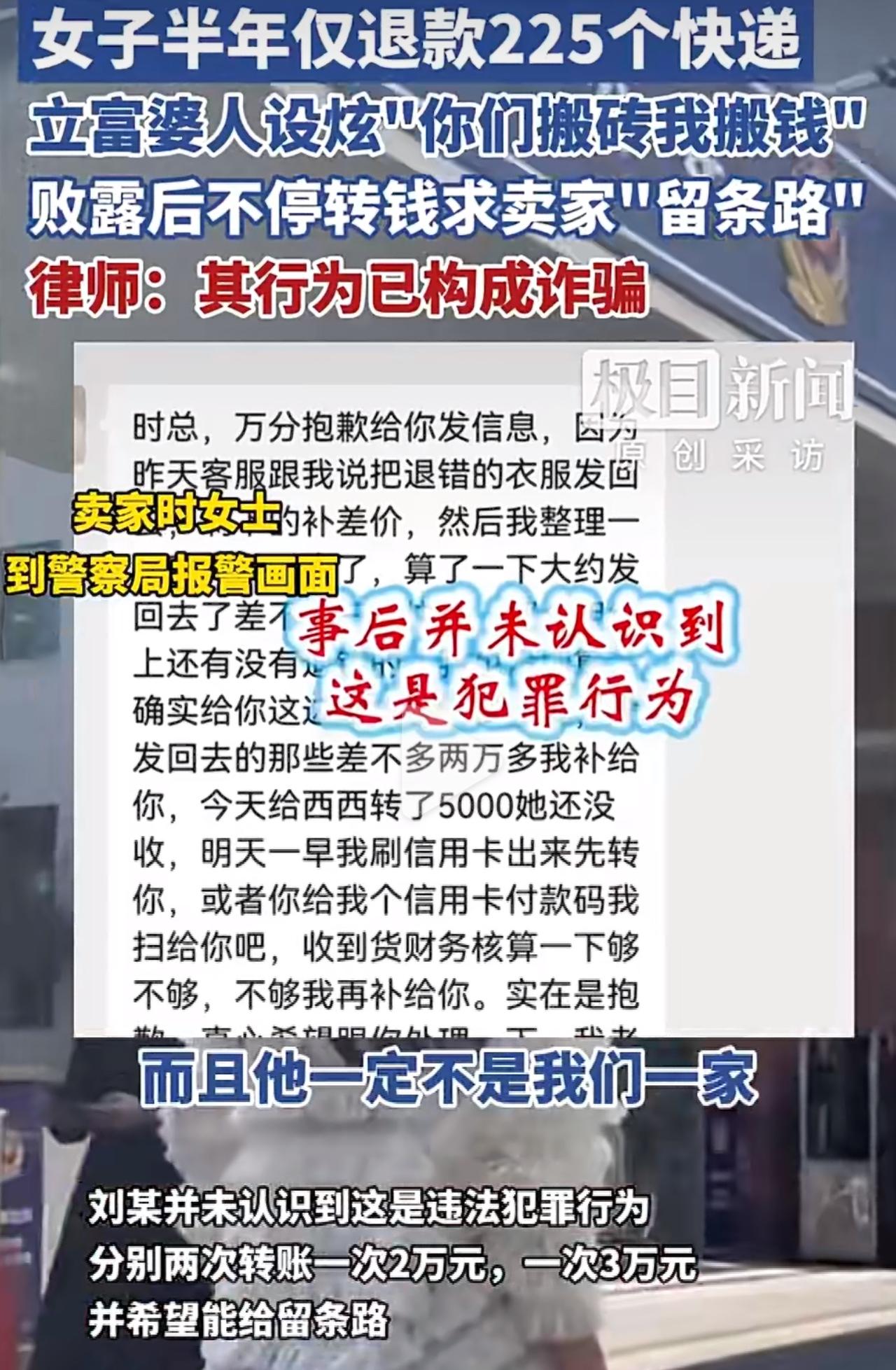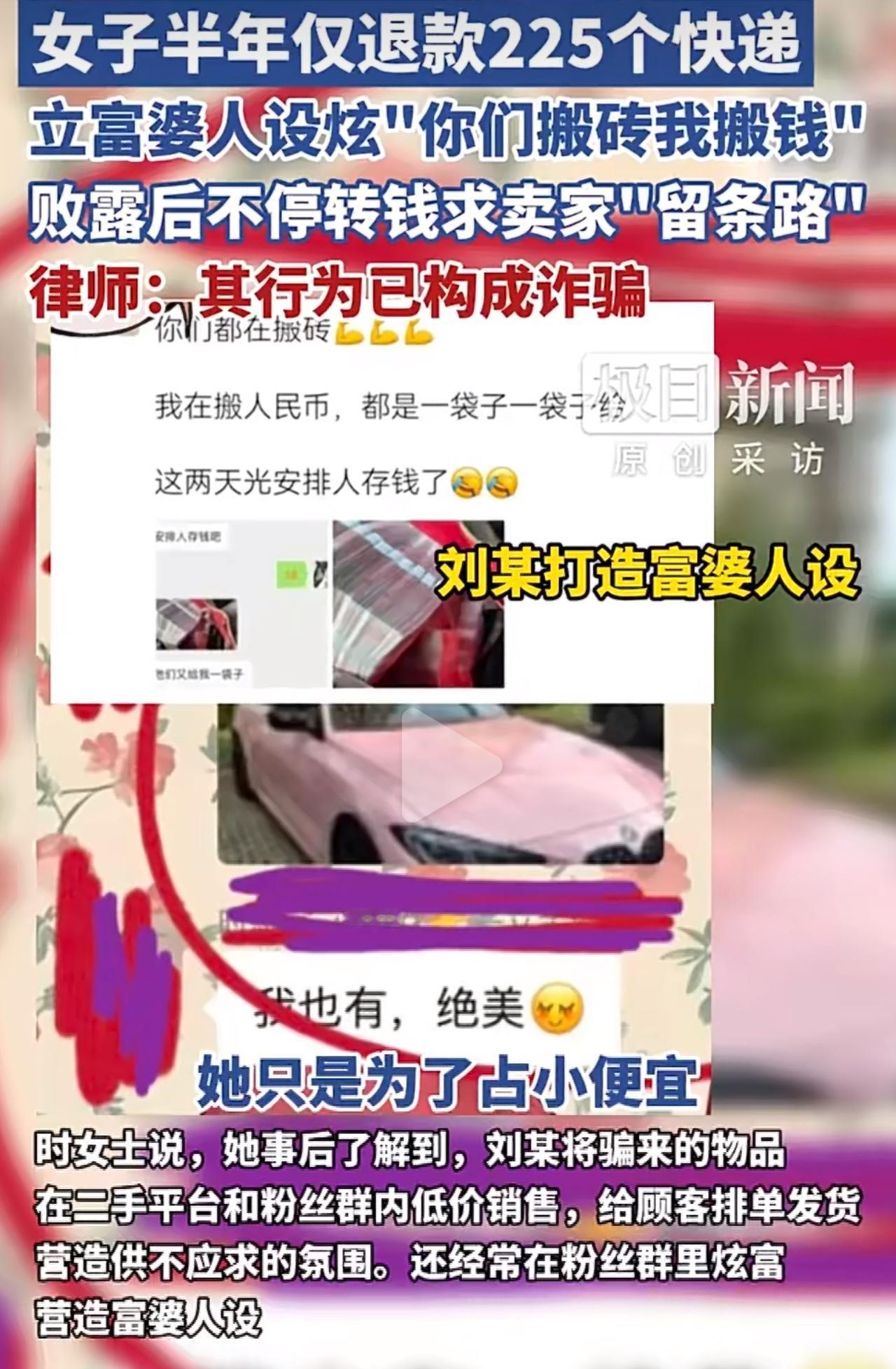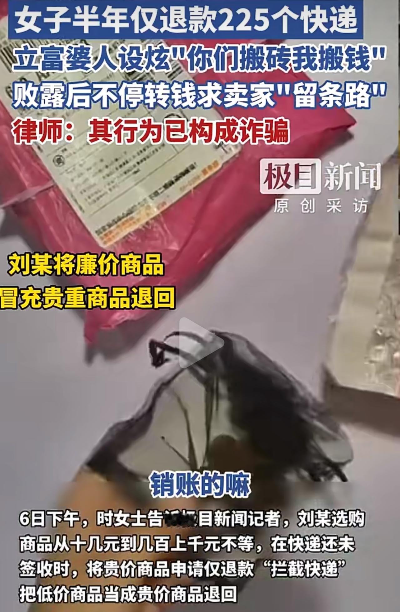真的越看越气,刷新三观了!现在居然有人专门钻平台漏洞薅羊毛,14个月骗了商家9万块,还装富婆摆阔气,反倒受害商家的一句话,比收拾骗子还解气! 广州做女装的时女士,最近算是被山东烟台的刘某坑惨了。一开始她就觉得哪儿不对劲,店里退款率平白无故往上冒,但想着可能就是偶尔运气差,也没往深了琢磨。结果有一回收到退货,包裹面单直接掉了,随手一拆当场就懵了,脑子一片空白——自己明明寄出去的是上千块的正经衣服,里头居然是些十几块钱的破烂小饰品,真是气不打一处来!她又气又急,手心都冒火,赶紧翻监控、对订单,越查心越凉:刘某竟然用6个账号搞小动作,专拍高价衣服,再买低价小东西调包面单,14个月就骗成了225次,损失从5万多硬生生涨到9万。 更让人膈应的是,刘某一边把骗来的衣服低价转卖赚黑心钱,一边在网上发“你们搬砖我搬钱”,装成富婆炫耀。被揪出来之后,她还扯谎编瞎话,哭唧唧说自己老公没了、一个人带娃多不容易,转了5万块钱想私了,让时女士别追究。可时女士半点不心软,当场就给拒了,压根不吃她这套。现在刘某已经被警察控制住了,就这涉案金额,大概率得判个3到10年,纯属自己作的,活该! 结果这事一出,居然有人借机骂整个山东人,太离谱了!时女士倒是清醒,第一时间就表态:地域从来不是分善恶的标签,每个地方都有好人有坏人,我绝对不限售山东。这话一出直接圈粉无数,凭啥一个人的恶,要让一整个地区的人背锅啊? 说实话,刘某为了装富婆铤而走险,人品烂透了还触犯法律,活该被严惩。而时女士不被情绪带偏,不搞地域歧视,这份清醒和格局是真的难得。平台该赶紧补漏洞,骗子该罚就罚,但咱们也得明白:不能让一个人的恶行,毁了一整个地区的名声。全额退款骗局 网购退款陷阱 淘宝诈骗