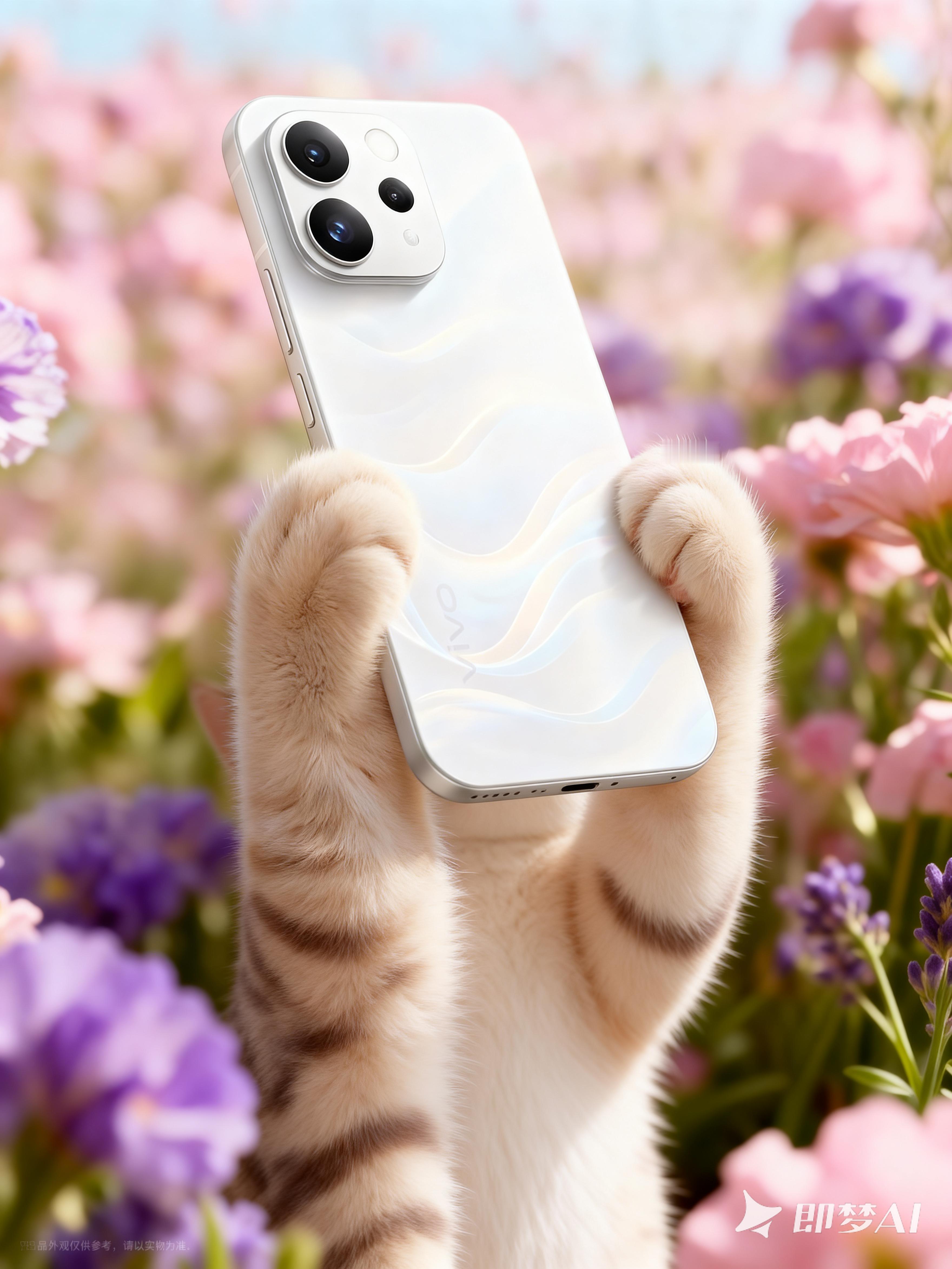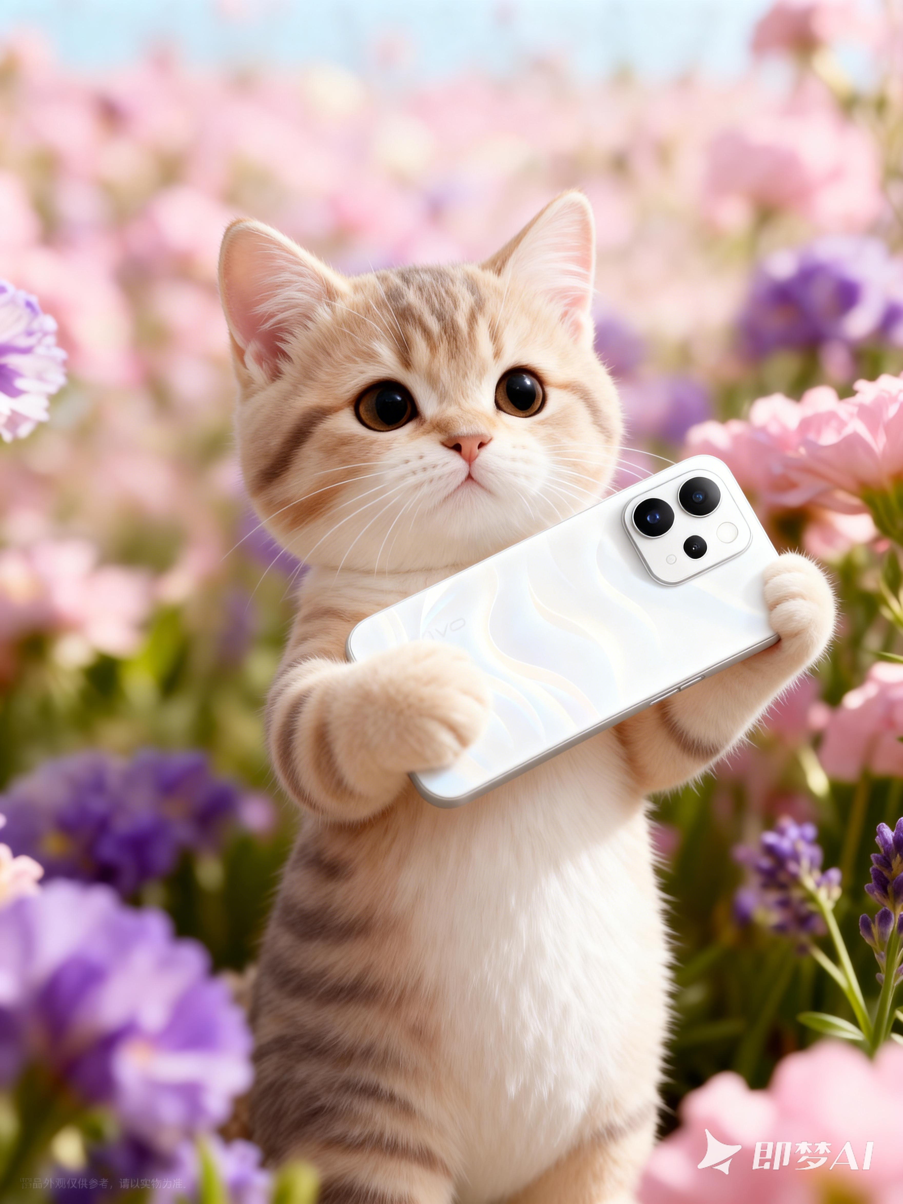 早啊,好久没用国内AI生图,今天随手用了一下,发现体验已经大进步了,效果真好。猫咪手捧vivo S50,花丛中自拍