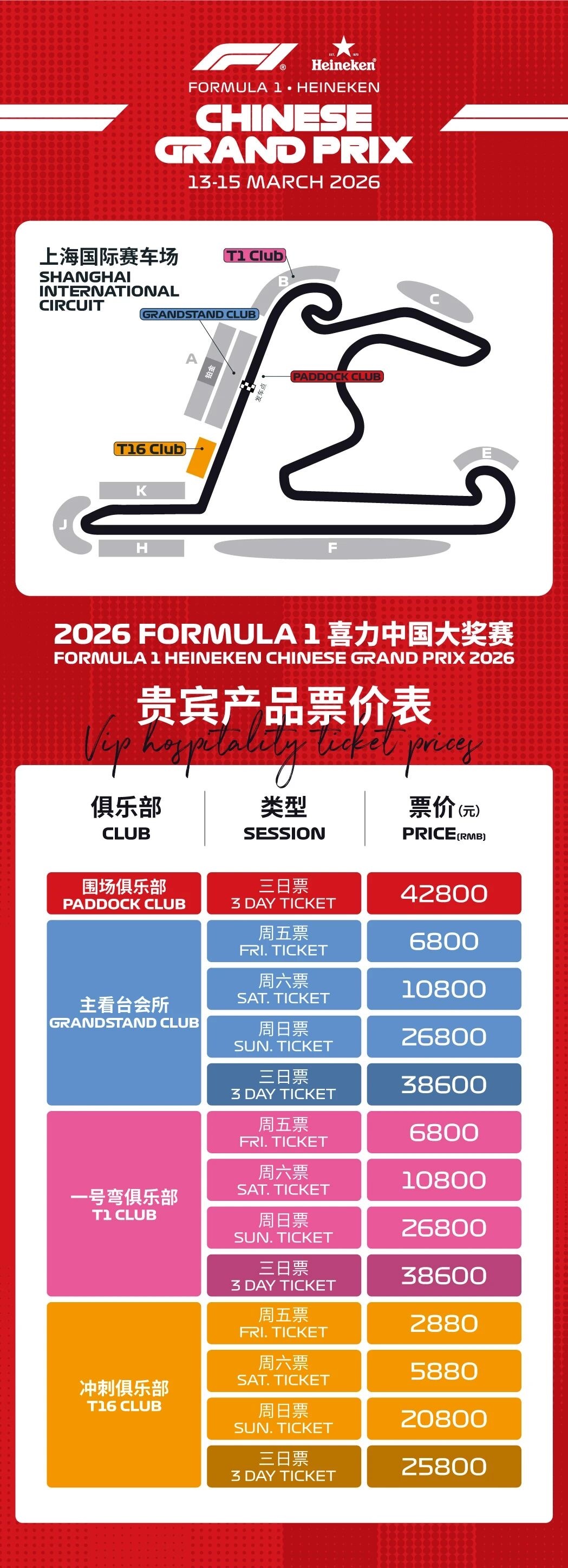 明天上午11点,2026年F1中国大奖赛就可以抢票了!冠军们准备好了吗?中国大奖赛将于3月13日至15日在上海国际赛车场举行。所有门票分为三类:贵宾票,看台票以及草地票。有A,B,H/K,E,C/F/J几处可选。其中A看台为主看台,位于发车直道部分。A铂金位置在最上方最中间的位置,可以看到P房以及大部分的赛道区域。视野绝佳但价格较高。A上同样可以看到大部分的赛道位置。A下只能看到发车直道部分,但会离P房及赛车更近。B看台位于直道末尾,1号弯位置。靠缘分可以看到精彩的缠斗及超车画面。不好的点在于B看台没有雨棚,如果遇到下雨和大太阳,冠军们记得要带好雨具做好防晒。H和K看台处于T14发卡弯。大直线尾端也是超车与反超车时常出现的位置,这里看不到P房,貌似过往现场的大屏幕也不大,但离车比较近,也能很清晰的听到F1极速时的呼啸以及长刹车区下的退挡声音。E看台是今年新增的看台,且只有三日票可选,位于T12至T13低速转高速的位置。C/F/J是三处草地票位置,F位于大直道边,感觉会略有单调。J我感觉不错,正对直线尾,极速,制动,转向,加速以及可能的超车都可能看到,如果我去的话,会带个望远镜。贵宾票就不详细介绍了,相信有实力的冠军们已经准备好了(主要是懒得写了)期待和冠军们现场相见,记得合影欣哲频道f1中国大奖赛攻略