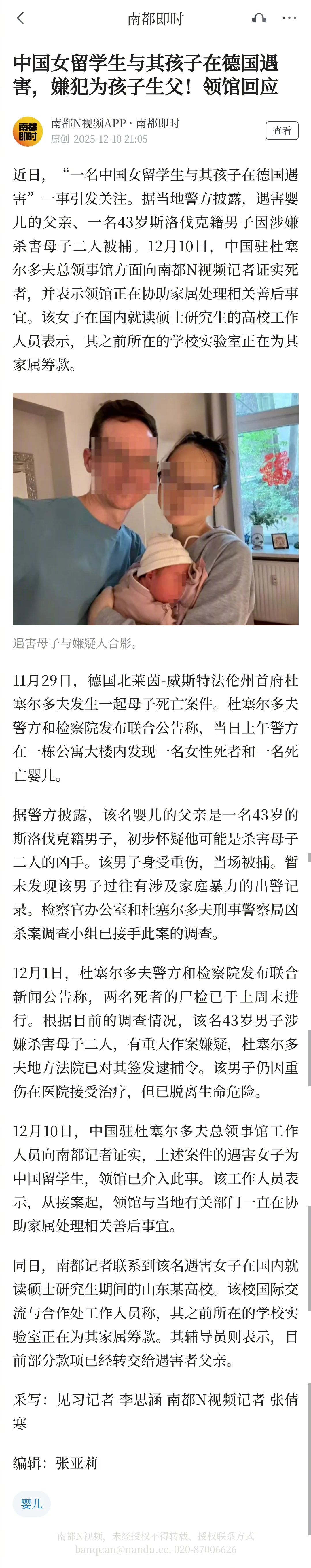#领馆回应中国女留学生母子遇害#【中国女留学生与其孩子在德国遇害,嫌犯为孩子生父!领馆回应】#中国女留学生母子在德国遇害#近日,“一名中国女留学生与其孩子在德国遇害”一事引发关注。据当地警方披露,遇害婴儿的父亲、一名43岁斯洛伐克籍男子因涉嫌杀害母子二人被捕。12月10日,中国驻杜塞尔多夫总领事馆方面向南都N视频记者证实该案件,并表示领馆正在协助家属处理相关善后事宜。该女子在国内就读硕士研究生的高校工作人员表示,其之前所在的学校实验室正在为其家属筹款。11月29日,德国北莱茵-威斯特法伦州首府杜塞尔多夫发生一起母子死亡案件。杜塞尔多夫警方和检察院发布联合公告称,当日上午警方在一栋公寓大楼内发现一名女性死者和一名死亡婴儿。据警方披露,该名婴儿的父亲是一名43岁的斯洛伐克籍男子,初步怀疑他可能是杀害母子二人的凶手。该男子身受重伤,当场被捕。暂未发现该男子过往有涉及家庭暴力的出警记录。检察官办公室和杜塞尔多夫刑事警察局凶杀案调查小组已接手此案的调查。