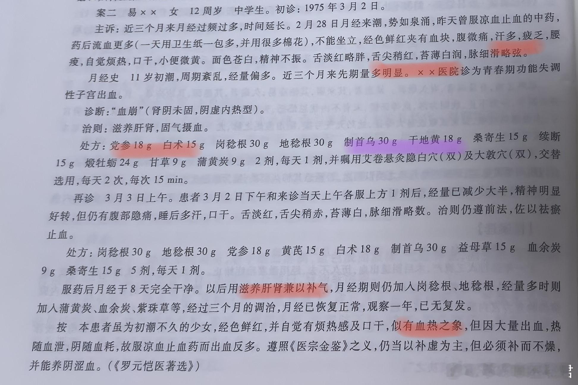 比如罗元恺治疗的这例少女,月经过频,经期延长。患者经色鲜红,自觉烦热、口干,脉弦细滑,很像血热证,但予凉血止血不效。仔细观察,患者还有疲乏、汗多、精神不振、舌体胖,苔润,这些气虚的表现,也有腰酸肾虚的表现。于是罗元恺处方里有补气的,有养阴血的,有补肾的,还有专门收敛止血的,后面患者腹痛,又加了化瘀止血的,疗效很好。教材里的证型让她占全了!罗老分析,大量出血,热随血去,没那么多热了,舌苔润了,胖了,出汗,疲乏,气也随血而去,变成了气阴两虚,气血不足。所以程门雪先生说,明医并不是次次都药到病除,但他理论功底扎实,心中有好几套治疗方案,他会变!
