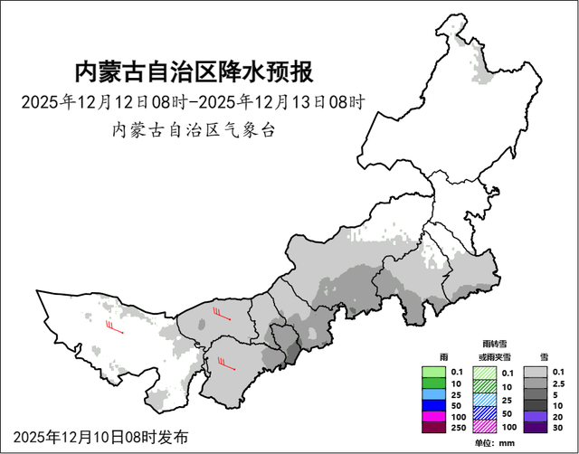 12月10日,记者从内蒙古自治区气象局了解到,新一股较强冷空气来袭。11日至13日,内蒙古自西向东迎大范围风雪、降温天气,中西部部分地区将现中到大雪,多地气温下降6至8℃,局部地区降温超8℃,同时还有大风相伴。公众要及时关注临近预报信息,出行做好防风保暖措施。降雪天气路面湿滑、结冰,司机朋友们需保持安全车距,稳驾慢行。