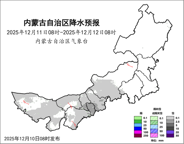 12月10日夜间至11日,内蒙古西部偏西和偏东北、中部大部、东部偏西和偏南地区多云,有分散性小雪;西部偏东和东部偏东地区有4、5级短时6级偏西风;中东部大部地区气温下降4至6℃,局部地区气温下降6℃以上。