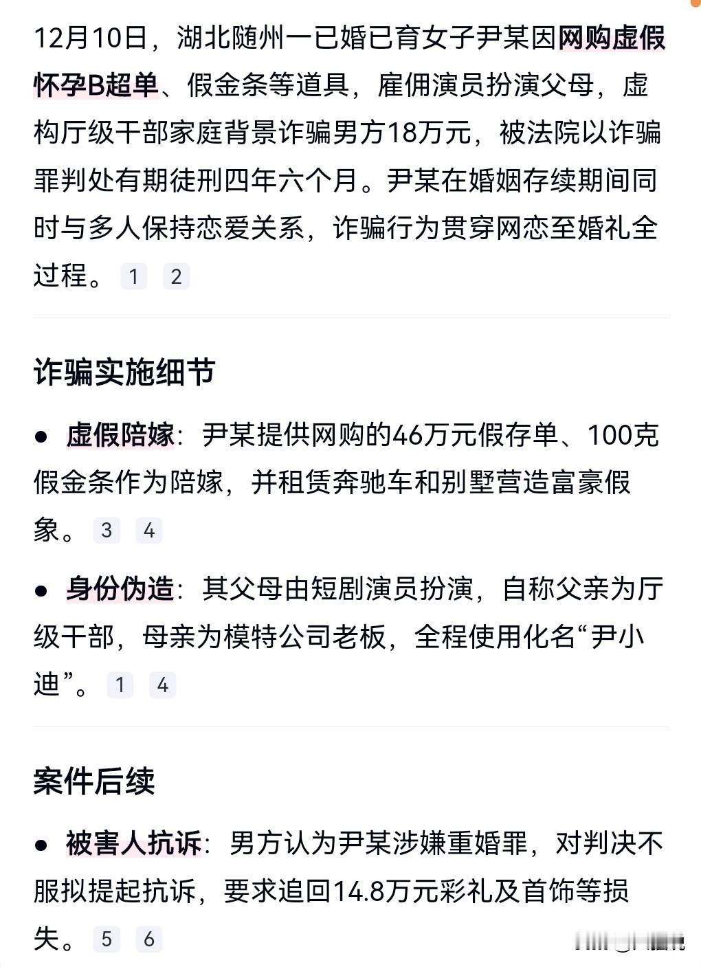 这年头骗婚的好可怕,好猛啊。 真是防不胜防。 已婚已育女子网购怀孕B超单骗婚,连父母都是找人扮演的。 而且这女人还是个已婚的,结过两次婚,和多个人同时保持恋爱关系。 这么用心良苦就为了骗十几万的彩礼。 一审获刑4年半。 男方不满判决,希望女子必须退回彩礼。
