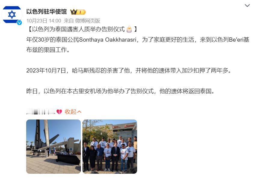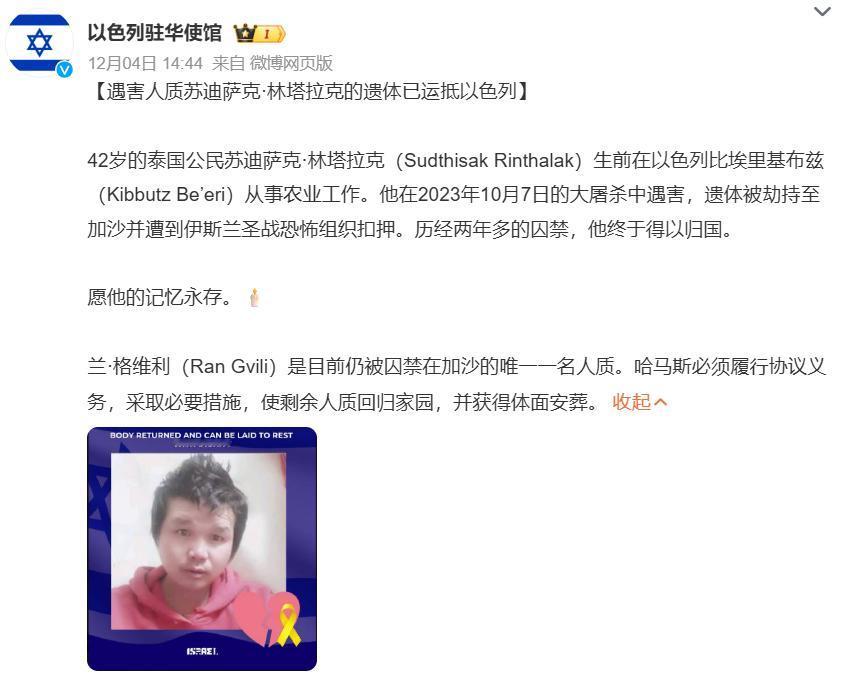 以色列昨天为一名泰国遇害人质举行了告别仪式,将他的遗体运回泰国故土。 以色列人质与失踪者事务协调员向泰国人质致哀:“我们遭遇重大恐怖袭击,没有能保护好你。让你平安归家耗费了太久、太久的时间。” 这名泰国人质是42岁的林塔拉克,他在两年前的10.7大屠杀中遇害,随后遗体被带入加沙扣押,两年后的12月4日,他的遗体终于被归还。 加上之前被归还的几具泰国人质遗体,至此,泰国人质已全部返回故土。以色列对他们家人的承诺历经曲折终于完成。 截至目前,只有最后一名人质遗体还没有归还,他是以色列警官兰·格维利。 之前的几次泰国人质遗体归国,以色列都为其举办了庄重的送别仪式。