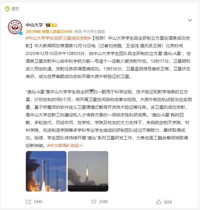 【中国太过分了!手搓高超音速导弹后,又手搓卫星,还让外国人活不?】说到聪明才智,中国人排第二,估计世界上真没国家敢称第一。世界上绝大部分国家都无法实现的硬核科技,我国不仅能集全国之力研究出来,如今甚至可以“手搓”。这让其他国家看见,得多自卑? 近日有报道称,我国一家名叫四川凌空天行科技有限公司的民营企业,竟然造出了高超音速导弹。要知道,这款武器,世界上也仅有我国、俄罗斯、美国等少数国家有能力研发,绝大部分国家是没有这个实力的。而我国竟然靠民营公司,就实现了这一壮举。相关消息一经发布,就引爆了全球网络。 据介绍,这款导弹名叫“驭空戟-1000”,射程覆盖500至1300公里,飞行速度可达5至7马赫,动力巡航时间为360秒。据介绍,该导弹还宣称具备自动识别目标、躲避威胁等智能特性。 而且,由于采用了大量商用产品,充分调动民间资源,其研发成本竟然低至70万元。相比之下,美国就算是拦截弹,成本都比它高10倍还不止!如果这种导弹能够量产,哪怕成本再高点,性能稍微差一点,也足以打破现有战场规则和格局。站在中国对面的国家,恐怕就“没法活”了。 说实话,能手搓高超音速导弹,在这个世界上就已经相当超标了,理论上其他飞行器也可以。这不,我国最近又手搓了一颗卫星。 2025年12月10日中午12时03分,中科宇航力箭一号遥十一运载火箭在酒泉卫星发射中心发射升空。它搭载的卫星,名叫“逸仙-A星”。最厉害的是,这颗卫星,是由一群来自中山大学的大学生研制的。 这是一颗立方卫星,也就是比较小的卫星。从相关图片资料看,其和一张方形的坐垫差不多大。尤其值得称道的是,这颗卫星的外板是木质的。13时38分,卫星遥测信号接收正常,卫星状态良好,成为世界首颗成功在轨开展木质外板验证的卫星,首飞就创造了全人类的全新历史。 说起来,这颗卫星的研发进程,比上面的高超音速导弹还艰难。 该项目立项于2021年,经历了多轮迭代。由于研制者还是大学生,资源相当有限,因此长期以来学校、学院以及校友的大力支持,中山大学的航空航天学院、材料学院、先进制造学院等多学科专业学生都加入进来。不夸张地说,这颗卫星是“吃百家饭长大的”。说它是手搓出来的,还真不夸张。 据报道,去年的时候,这颗卫星就一度准备发射了,不过在预告之后,没有了下文,不知道是推迟到了今年,还是当时的发射失败了。不论是哪种情况,这一年来,对于研发团队来说,必然是一次痛苦的历练,也更显得这颗卫星的宝贵。 从卫星到高超音速导弹,都是世界上大部分国家连想都不敢想的,在中国竟然靠民间力量就能搞定,实在是令人骄傲。未来,这样的案例想必会越来越多,再催动行业良性竞争,激发更先进的产品。 凭借14亿人的智慧,中国未来还能手搓出什么高科技,实在令人不敢想象!