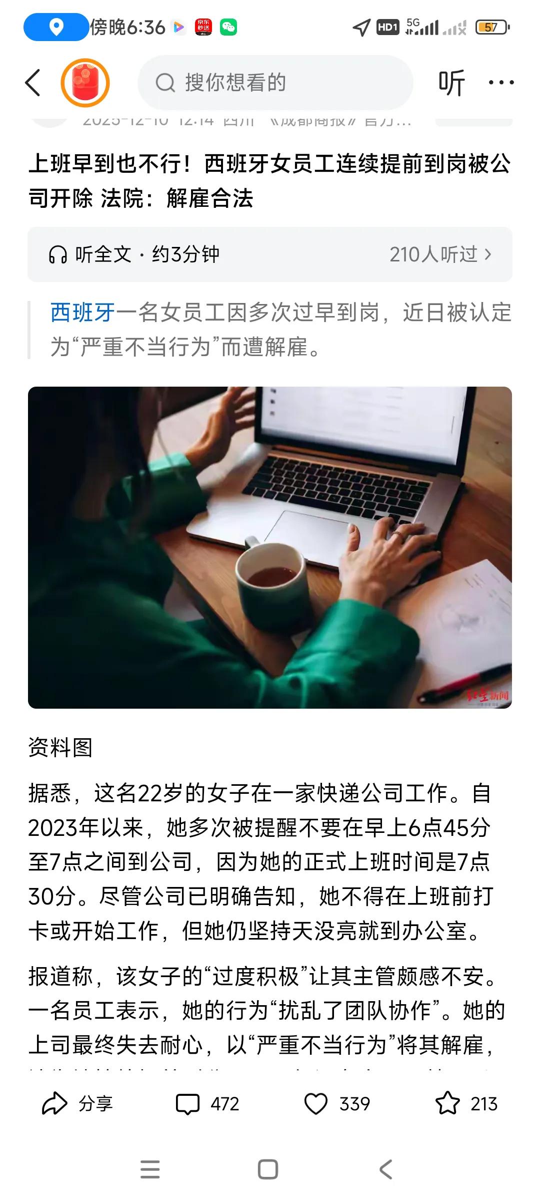 看来老外也是讲人情世故的,干啥要统一行动,不能过于积极,随大流最好,,[捂脸][捂脸] 西班牙女员工太积极了,提前半小时到岗,给其他员工带来不适,所以被解雇了,, 老板似乎也不欣赏她,上班来太早了,, 最后,法院判决也支持老板解雇的决定,[捂脸] 我公司,有个员工经常早来,晚走,太积极了,老板多次表扬他,让我们向他学习,,我们中午吃饭是一个小时,这个员工经常只吃半小时,吃完就进去工作了,我们吃一个小时,老板不怎么高兴,,, 不得不说,东西方文化的差异是很大的!