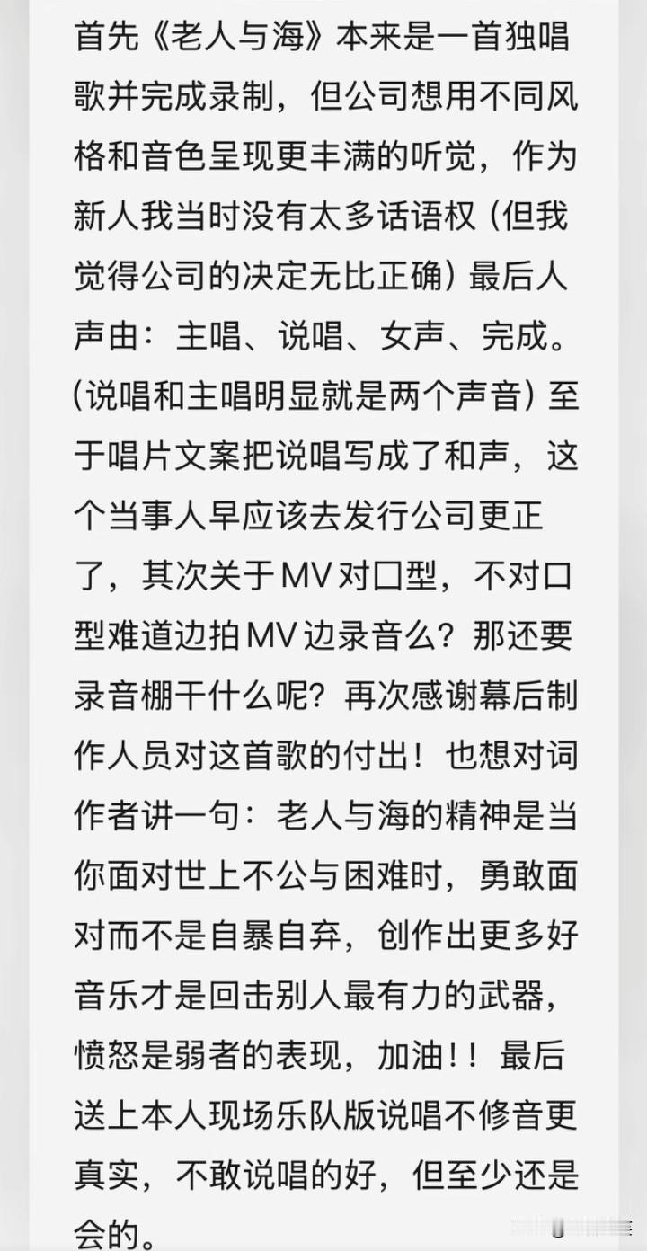 海明威没有否认,老人与海的说唱部分确实是朱其民唱的,把说唱写成和声是公司的决定,海明威作为新人,没有话语权。 当时朱其民也只是个大学生,还不懂得怎么维权,所以也没有去追究。 不过,有一点海明威确实做的不好,他从来没说过说唱部分不是他唱得,导致大家一直认为是他唱的,但其实说唱部分他只是对了口型。 海明威 老人与海