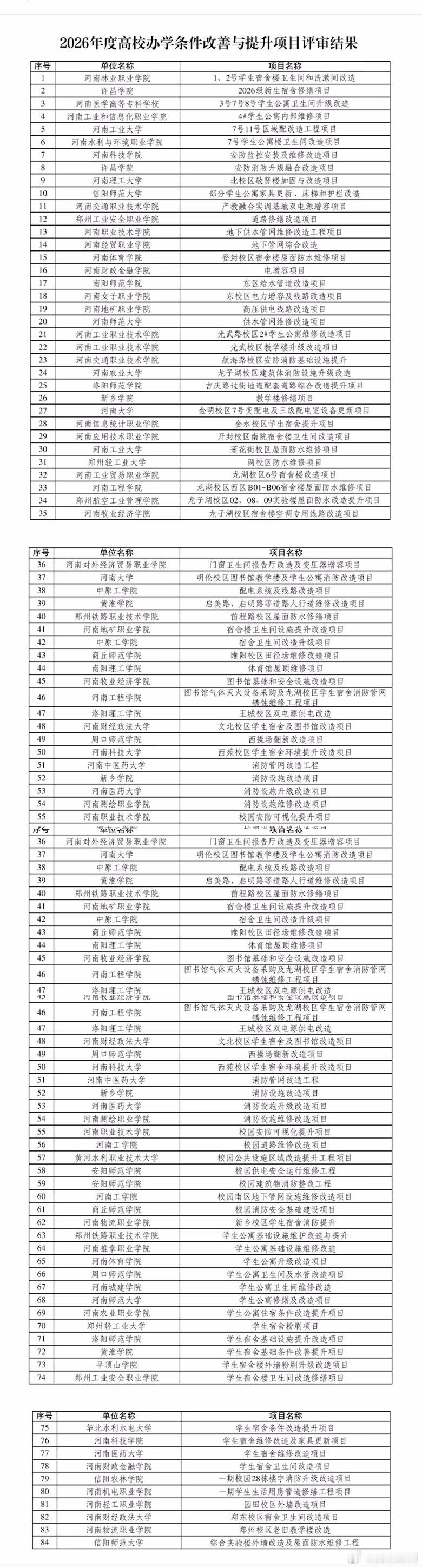 河南有84个高校项目改造获批 近日,河南省教育厅发布《关于2026年度高校办学条件改善与提升项目评审结果的公示》,经学校自主申报,省教育厅组织专家进行评审,评选出84个项目拟纳入支持范围,现将评审结果予以公示。根据《2026年度高校办学条件改善与提升项目评审结果》在84个拟纳入支持的项目中,超30个项目都与学生宿舍条件改造升级相关。中方录音一出日本有人看不下去了