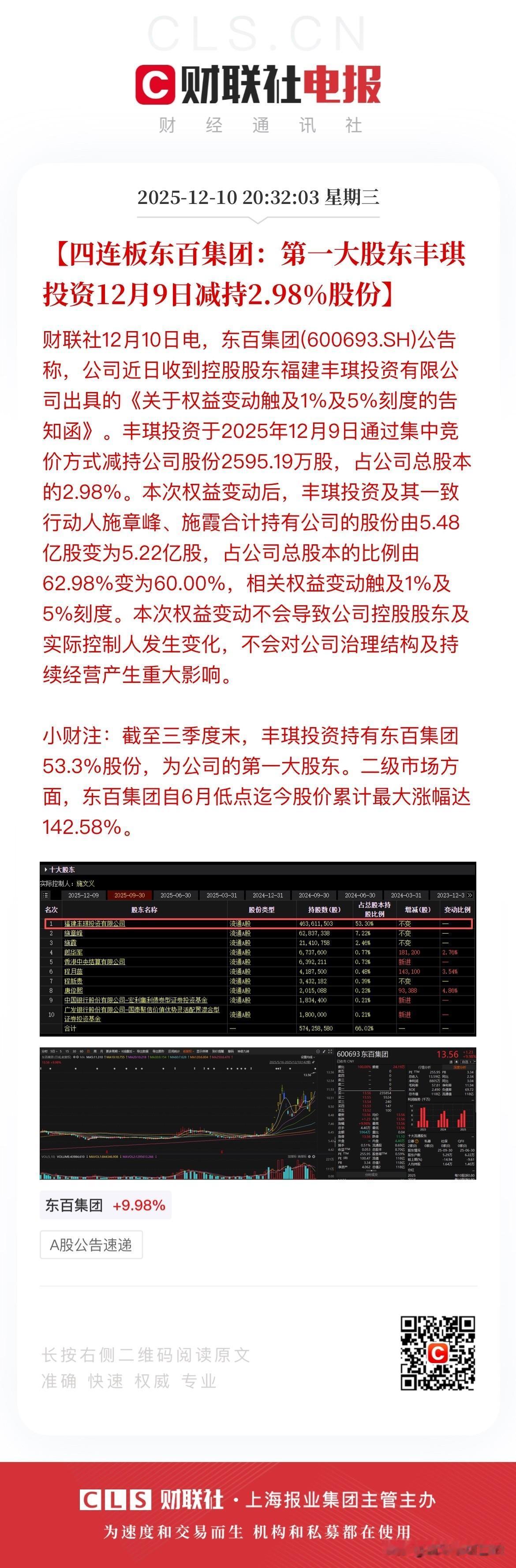股价大涨140%以后,东百集团大股东高位减持2.98%的股份,套现约3亿元! 东百集团是福建的一家百货公司,主营业务是做商业零售的,还有一部分的仓储物流和酒店餐饮等业务! 最近3年,该公司分别盈利了2178万、3505万和4349万元,业绩说不上好但也说不上差,毕竟现在商业百货不好干,很多百货公司都是亏损的。 但是就在近段时间,东百集团搭上了炒作福建板块的东风,出现了多波连续涨停,而在连续涨停之后东百集团距今年4月的低点已经上涨超过140%! 眼见此情此景,东百集团持股53.3%的大股东福建丰琪投资有限公司抓住这历史性机遇,果断于12月9日出手减持了2.98%的公司股份,一把套现差不多3个亿! 按最近3年该公司的盈利情况,东百集团大股东套现的一天套现的钱足够东百集团挣10年了,所以出现了这样的机会,他们减持是不是又合理的多了? 出人意料的是,在明知大股东大比例减持后,该票今天依然走出了一字板涨停,简直让人觉得不可思议!