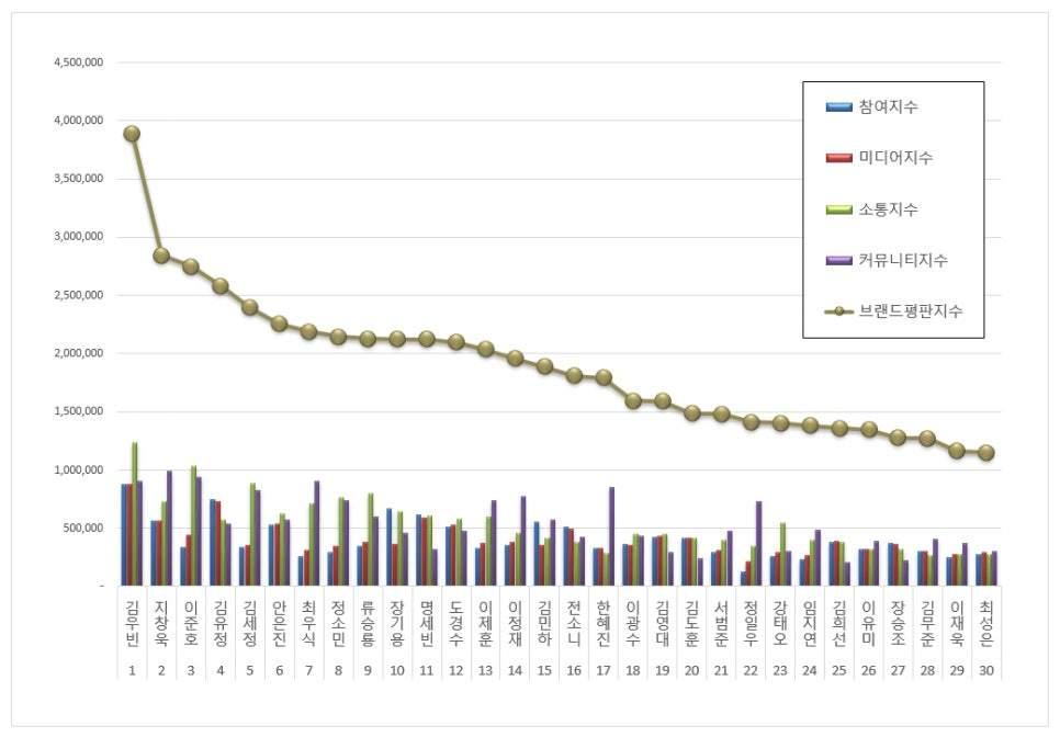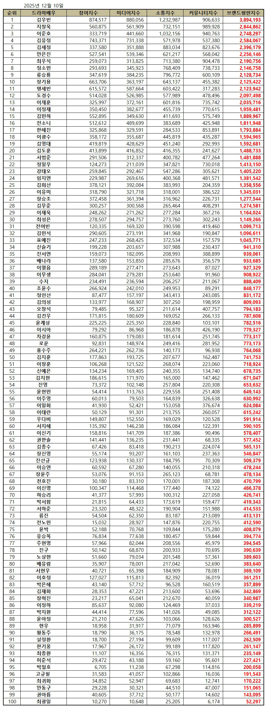 2025年12月电视剧演员品牌评价Top301-10名:金宇彬、池昌旭、李俊昊、金裕贞、金世正、安恩真、崔宇植、郑素敏、柳承龙、张基龙11-20名:明世彬、都暻秀、李帝勋、李政宰、金敏荷、全素妮、韩惠珍、李光洙、金英大、金度勋21-30名:徐范俊、丁一宇、姜泰伍、林智妍、金喜善、李瑜美、张胜祖、金武俊、李宰旭、崔成恩