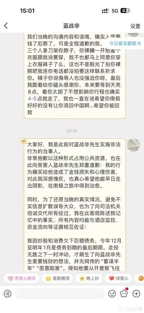 疑似绑架蓝战非当事人现身 梳理一下今天蓝战非某VIP群内一疑似当事人的自首爆料今天蓝战非VIP群内,有一疑似南非绑架案的当事人(网名“Sorry” )出来自述,因炒股和消费陷入巨额债务泥沼,今年12月到明年1月是债务到期大限,走投无路下,临时起意想找蓝战非索要钱财,并非网传 “蓄谋半年”“恶意陷害” 那套说辞。知道蓝战非要从开普敦飞南极后,匆忙订机票酒店,还说根据携程、去哪软件记录,能证明是临行前一天或当天才安排,没有提前布局。为堵到蓝战非,他摸清蓝坐头等舱、飞行时间短的习惯,在机场蹲守了三天 ,还找机组帮忙,先后联系了三名黑车司机,都提前说好 “不伤人、不带武器”(行车记录仪能作证 )。前两位司机听说要进房间,怕犯法,直接拒绝;第三位是在酒店楼下临时找的,带到房门口时,发现司机情绪不稳,怕闹出意外,赶紧让人家走了,酒店走廊、电梯、大堂监控都能证明司机很快离开,全程没有航空公司、出租车的掺和,也没有 “酒店内鬼”,他是仗着和蓝战非同为中国人,外貌不好辨认,冒充蓝本人补办了房卡(这事儿前台也有失职责任 )。当晚12点左右,他刷卡进入蓝战非房间,蓝战非还在睡。之前找的第二位司机让他不踏实,打发走后,屋里就剩他自己,后面四个小时也一直单独待着,酒店公共区域监控能查证。蓝战非裸睡惊醒受了惊吓是真的,但网传 “多人围堵”“架刀脱衣” 纯属瞎编。他就带了个防狼喷雾,进屋时举了下,很快放兜里;所谓 “枪支” 就是个道具,他一直拿手堵着枪口,没拿这个威胁蓝战非。冷静下来后,他跟蓝战非说清楚是来要钱的,反复保证 “绝不伤人” 。蓝战非从床上起来坐到沙发,自己换了T恤、短裤,还换了好几回坐姿,状态挺稳;他就坐在床尾,和蓝战非至少隔一米,没碰对方一下,也没暴力逼迫。聊天时,他还说 “能不能算借钱,我打借条” ,语气情绪都挺稳,没过激言行。最后蓝战非分两笔,转了108.8万到他国内实名账户。这事之后,他折腾了几回,想过自杀又放弃,现在跑到卡塔尔中国大使馆自首,请求遣返回国 。群里交流时,他承认自己是 “犯案本人” ,还在和蓝战非沟通,说自己手里除了还债的钱,还剩30多万能马上还,愿意签欠条,强调全程没伤人意思,创业失败走投无路才这样,希望蓝战非给条生路,也在积极变现资产准备退赔,想配合司法机关把事儿解决好。另外,还有一份英文的《刑事谅解书》,左上角能看到疑似蓝战非的签名,是否真实尚不确定。有群友质疑该人是想红才出来表演静待官方公布调查结果吧