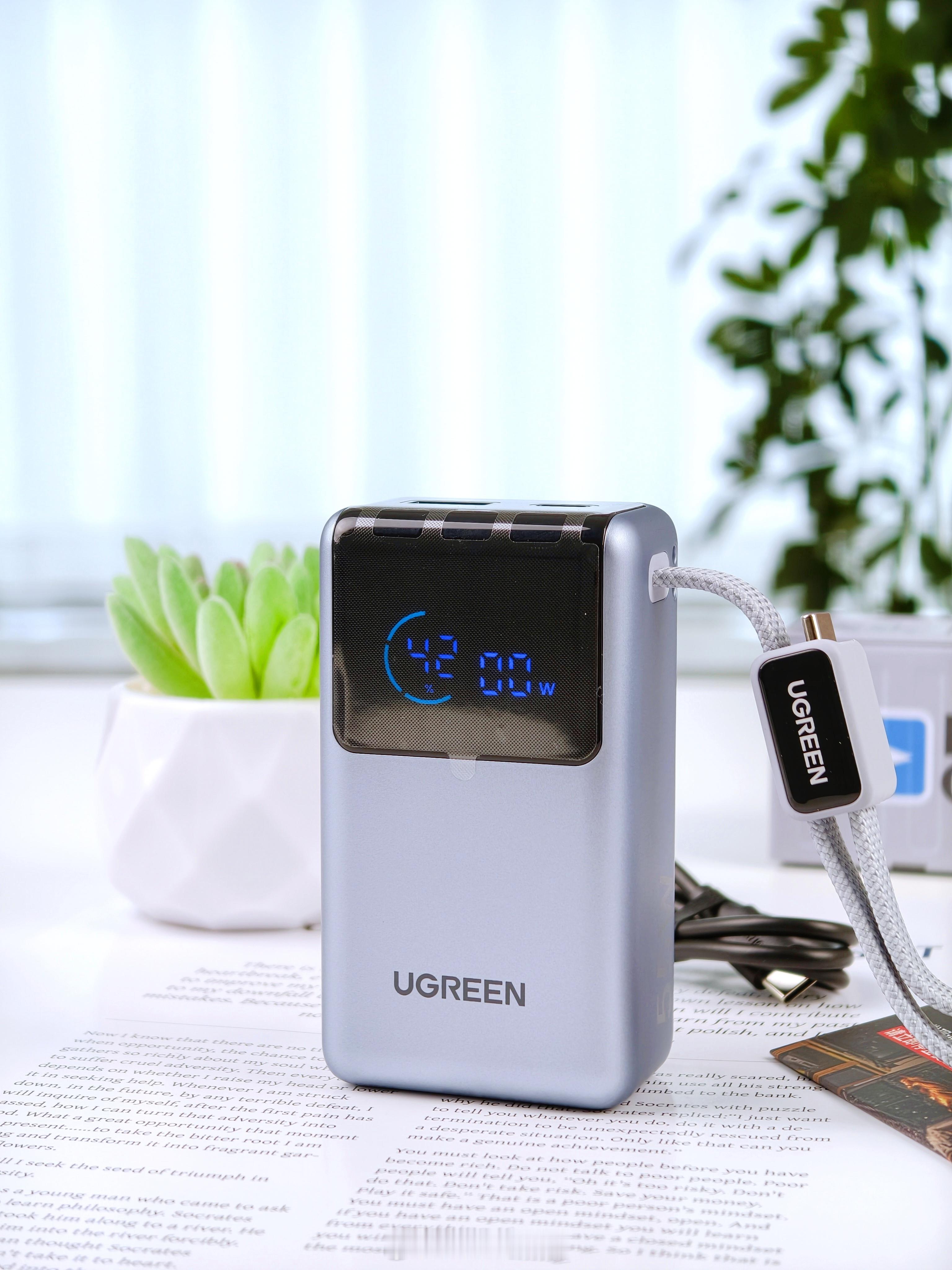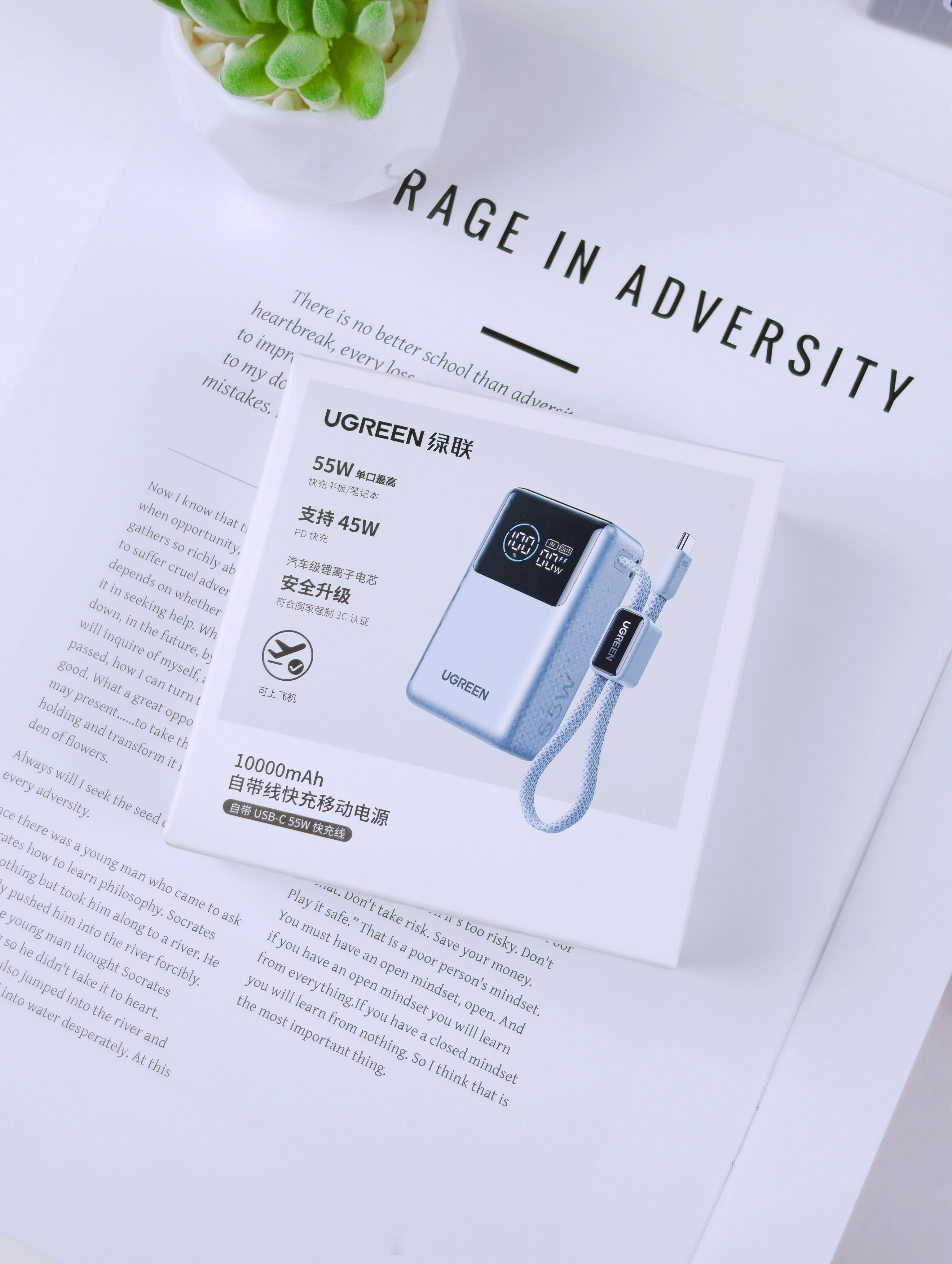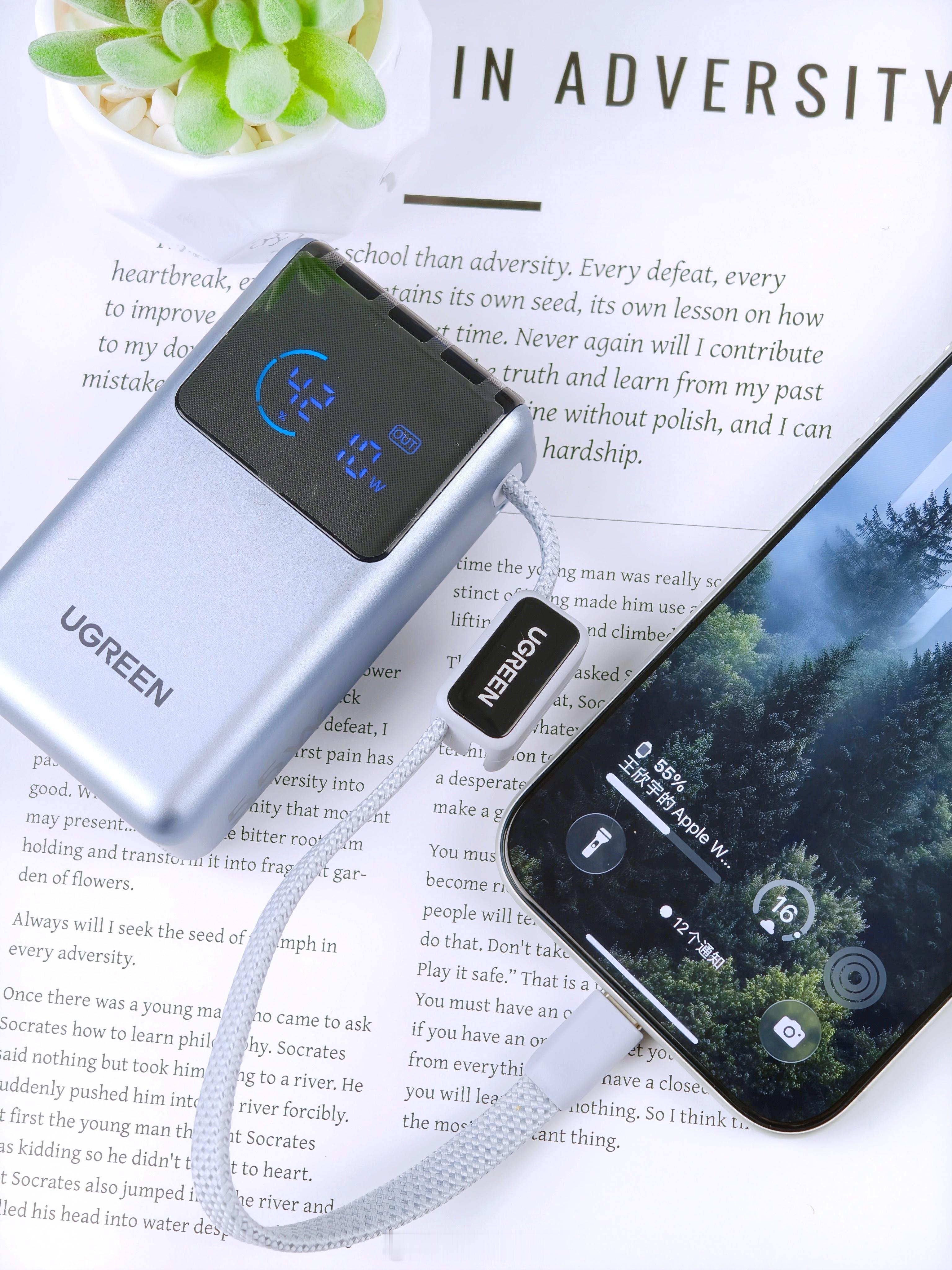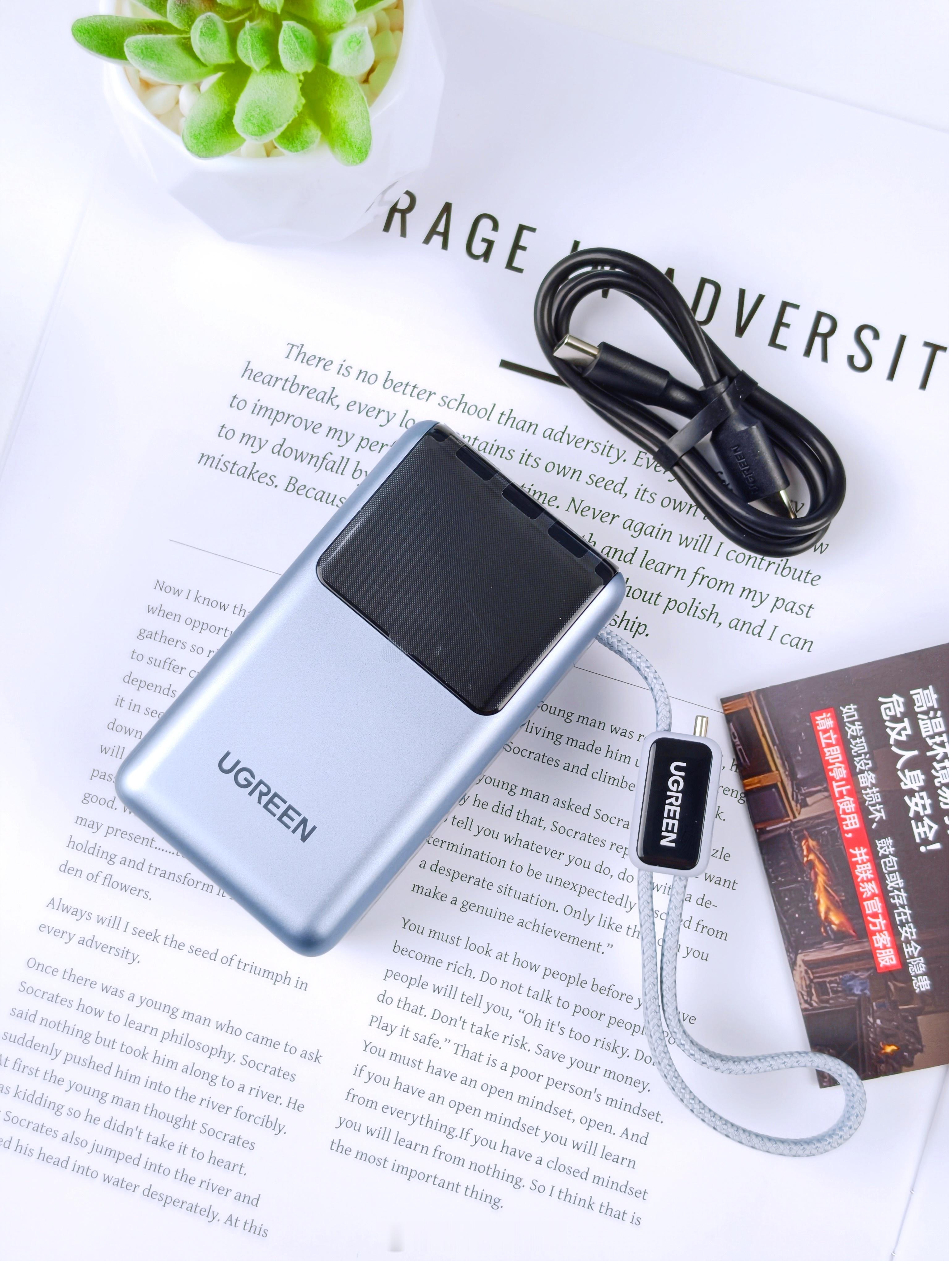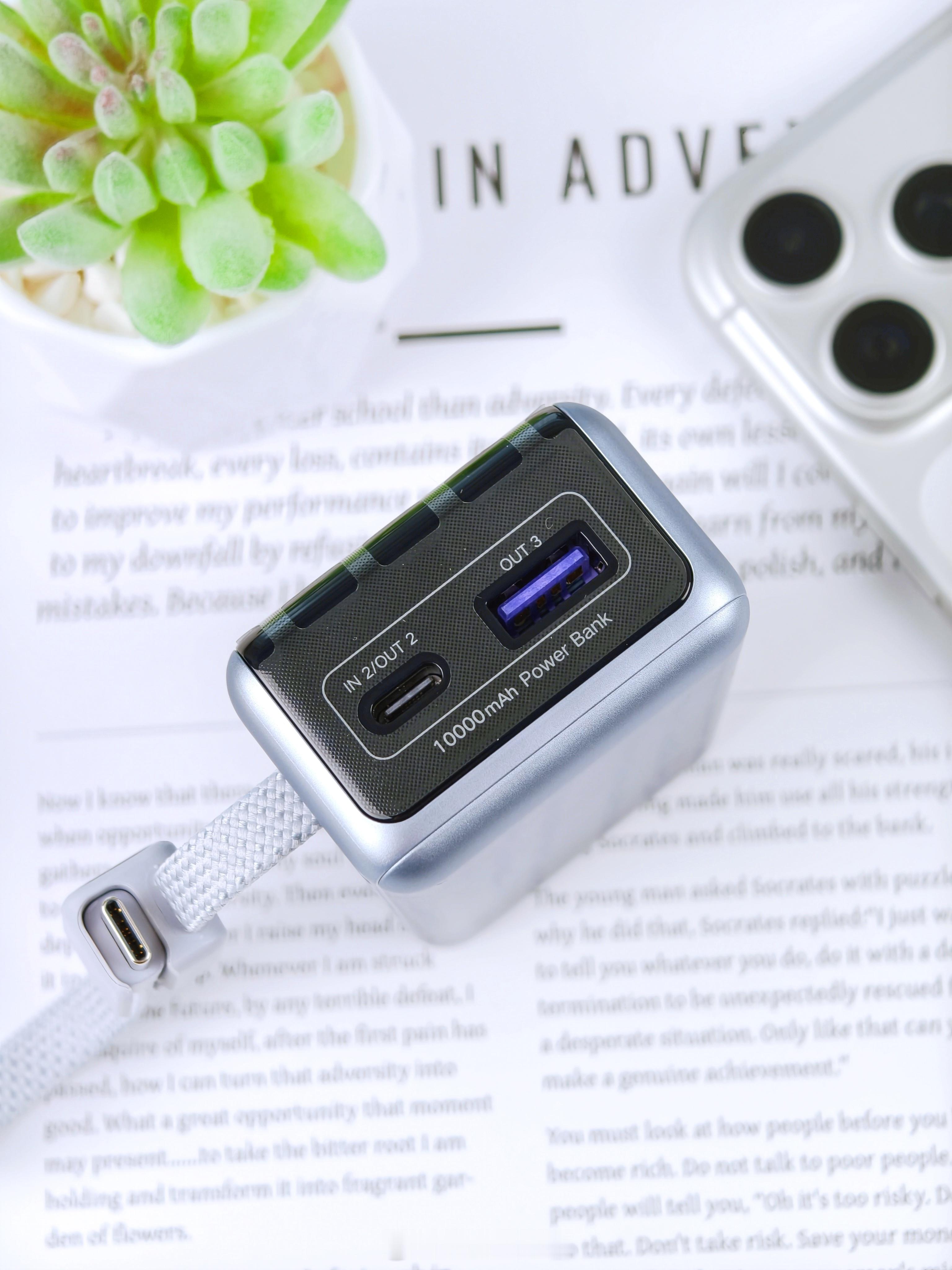 最近在用一个带线的小充电宝(能量湃Pro),主要是因为之前那块太大了,出门不太想带。这个体积相对小一点,几天用下来大概知道怎么回事了它能跑到55W快充,跟我手里的小米刚好适配。上面那个小屏幕倒挺直观的,能看到电量和功率,不用猜还有多少。容量是10000mAh,正常外出一天对我来说够用。它自带线,我就少带一根线,包里清爽一点。那根线还能当个小提手,拿起来比较顺手。整个大小差不多就是一包纸巾的体积,放口袋也不会鼓太明显