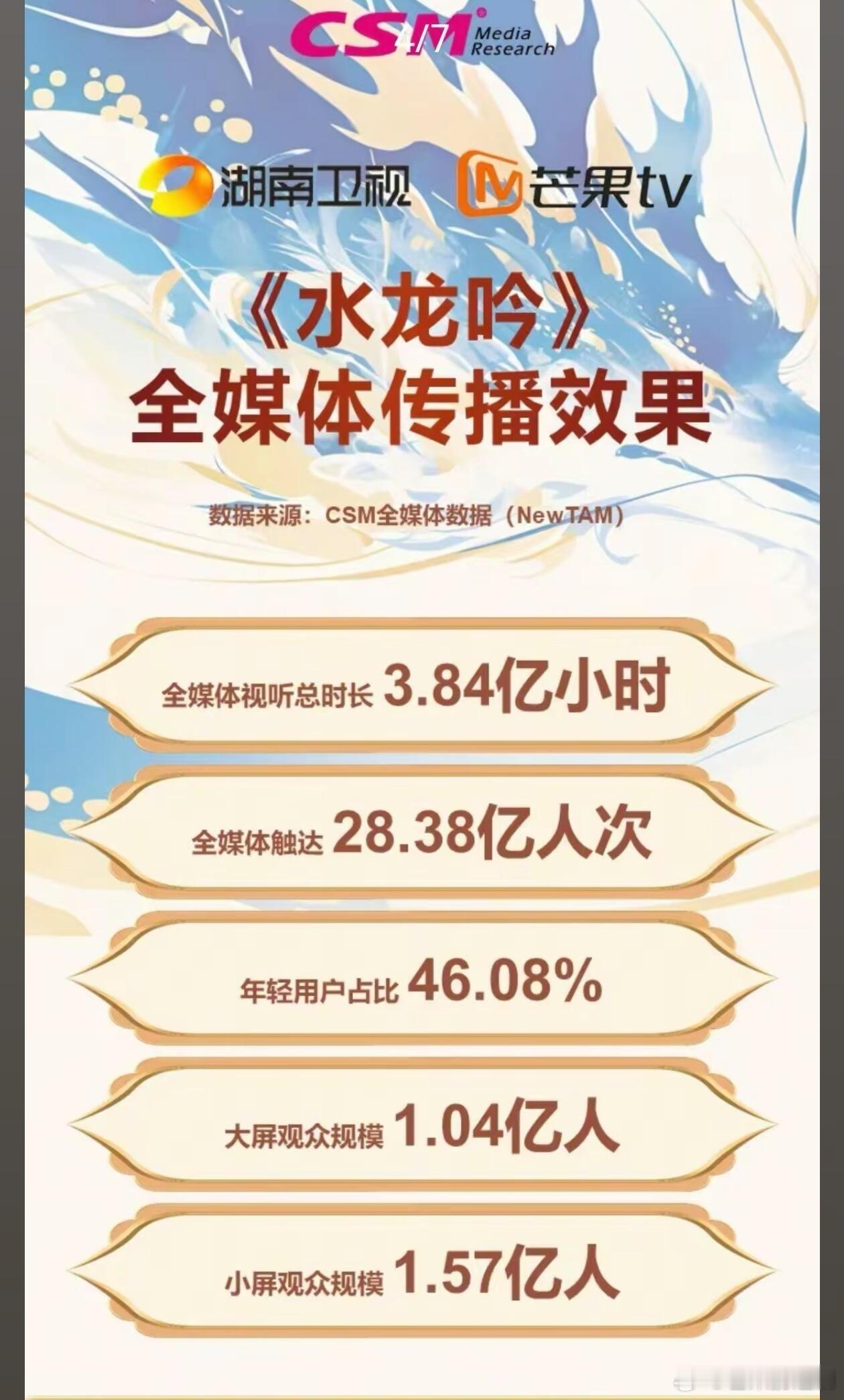 来自CSM官方数据,罗云熙《水龙吟》全媒体视听总时长3.84亿小时,全媒体触达28.38亿人次,年轻用户占比46.08%,大屏观众规模1.04亿,小屏观众规模1.57亿