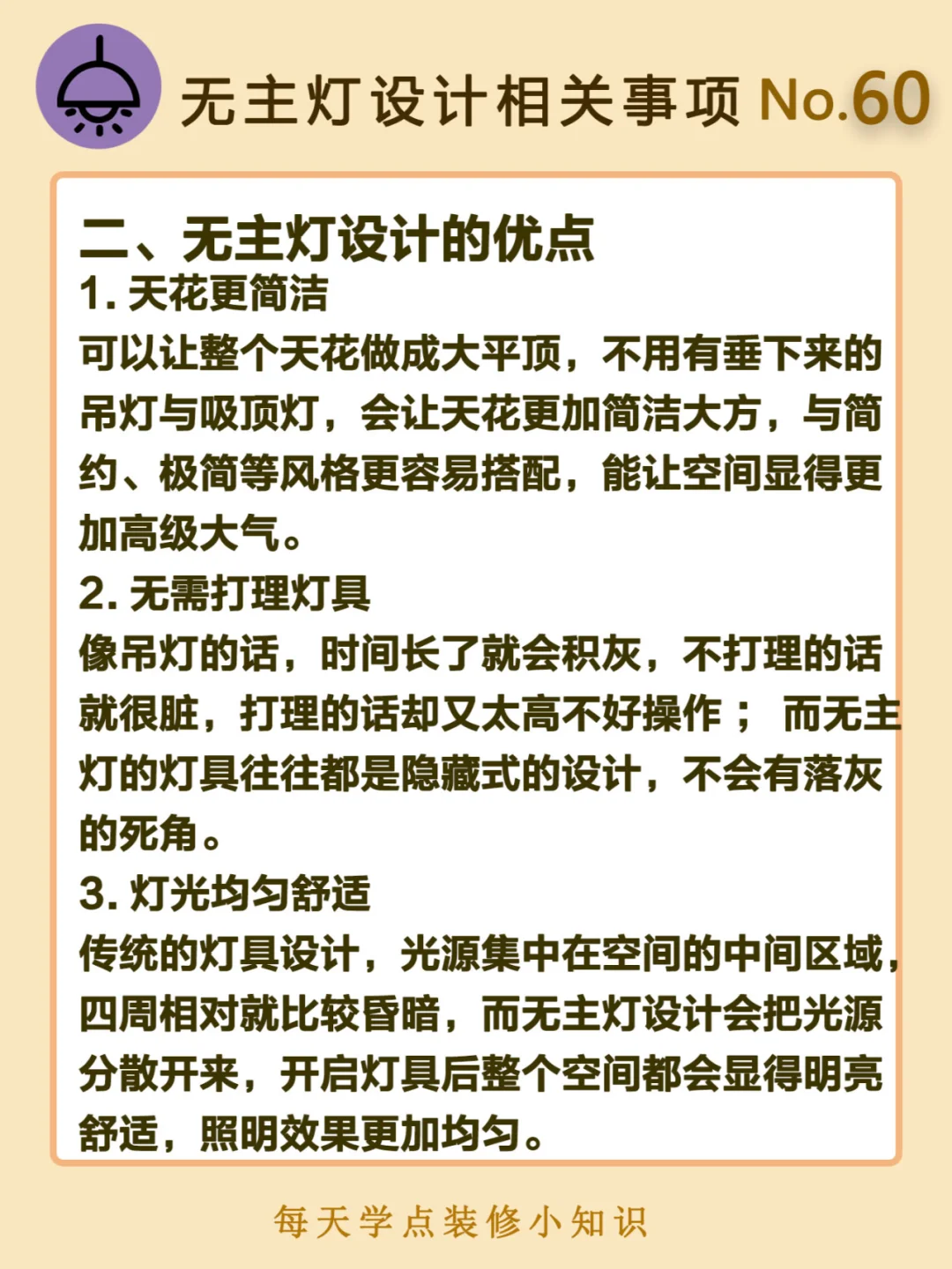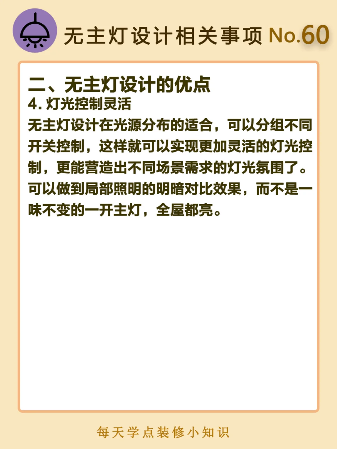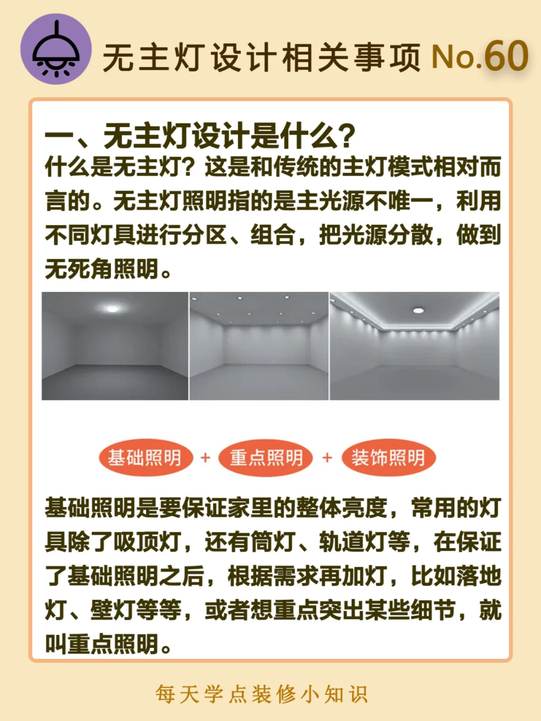 什么是无主灯?这是和传统的主灯模式相对而言的。无主灯照明指的是主光源不唯一,利用不同灯具进行分区、组合,把光源分散,做到无死角照明。基础照明是要保证家里的整体亮度,常用的灯具除了吸顶灯,还有筒灯、轨道灯等,在保证了基础照明之后,根据需求再加灯,比如落地灯、壁灯等等,或者想重点突出某些细节,就叫重点照明。值得一提的是,无主灯设计不是不要主灯或没有主灯。只是不依赖主灯,更多的时候需要多种灯具协同作战,打造见光不见灯的高级感。