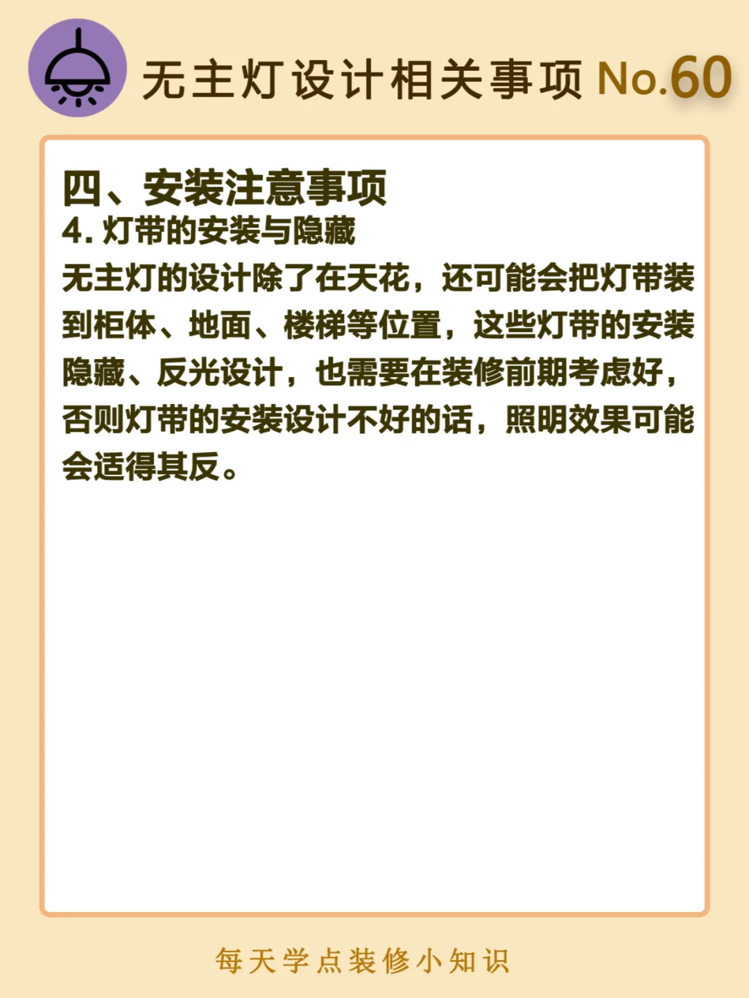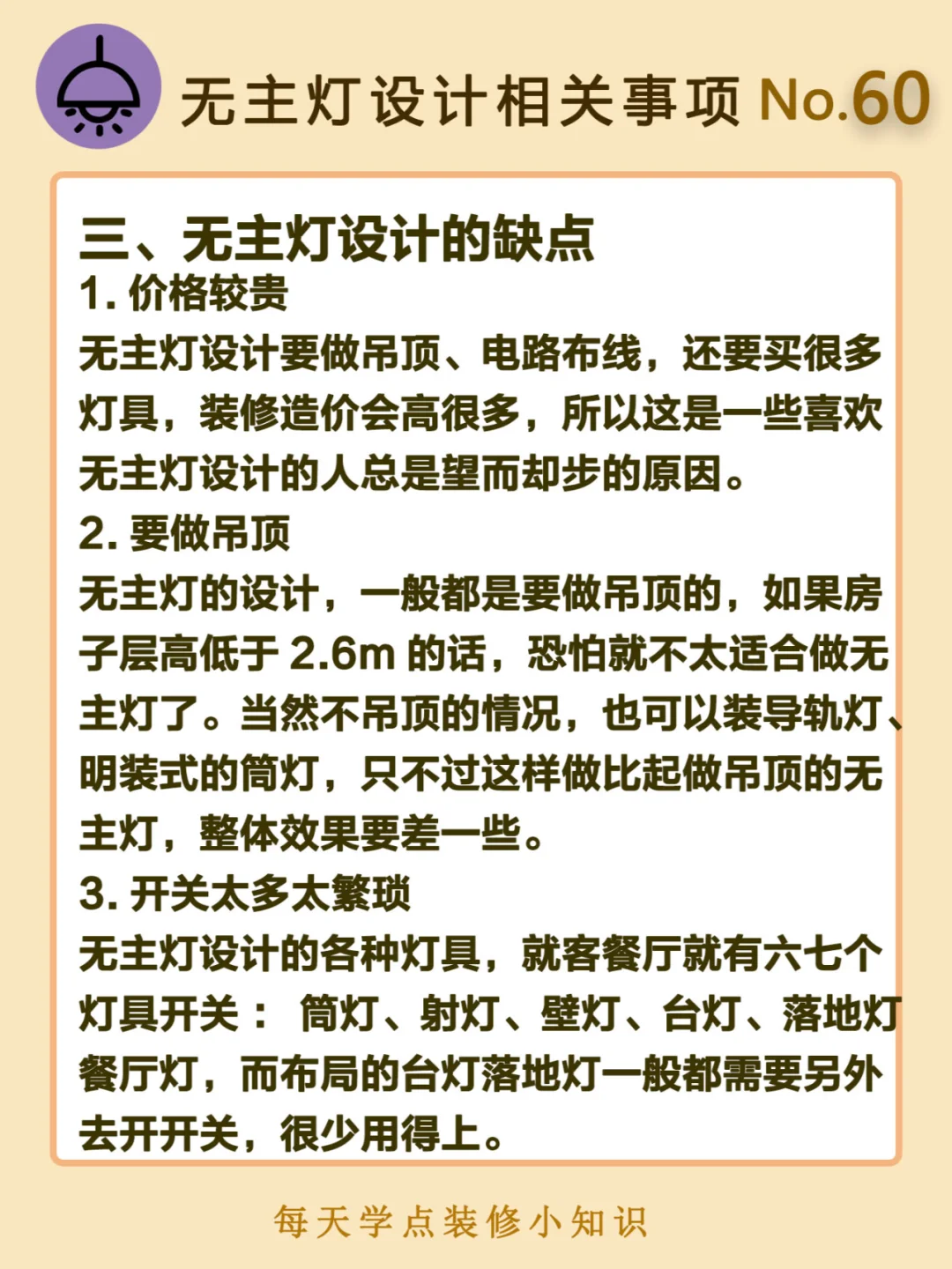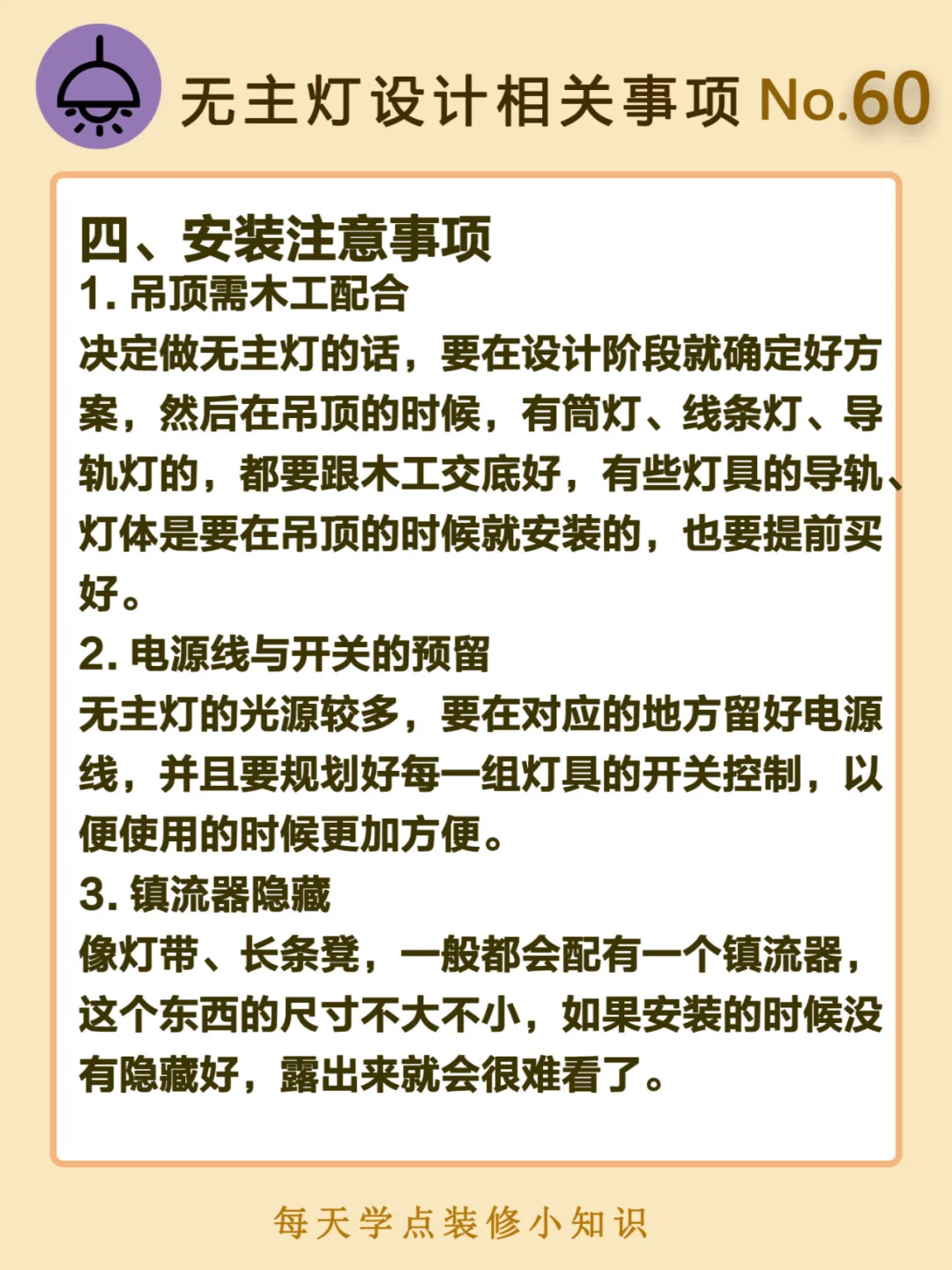 什么是无主灯?这是和传统的主灯模式相对而言的。无主灯照明指的是主光源不唯一,利用不同灯具进行分区、组合,把光源分散,做到无死角照明。基础照明是要保证家里的整体亮度,常用的灯具除了吸顶灯,还有筒灯、轨道灯等,在保证了基础照明之后,根据需求再加灯,比如落地灯、壁灯等等,或者想重点突出某些细节,就叫重点照明。值得一提的是,无主灯设计不是不要主灯或没有主灯。只是不依赖主灯,更多的时候需要多种灯具协同作战,打造见光不见灯的高级感。