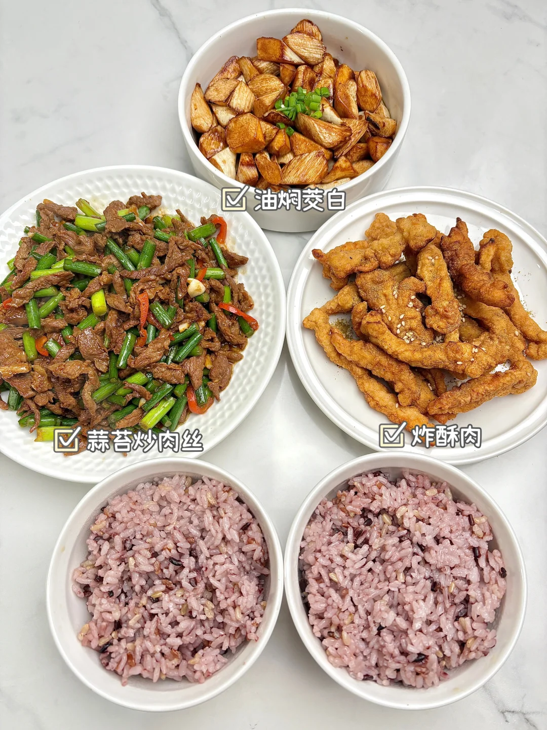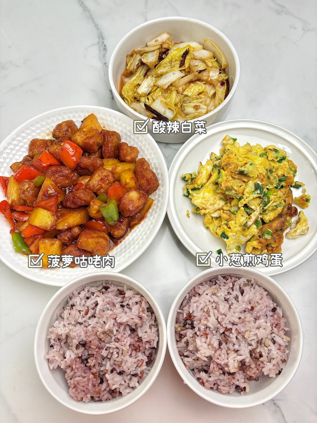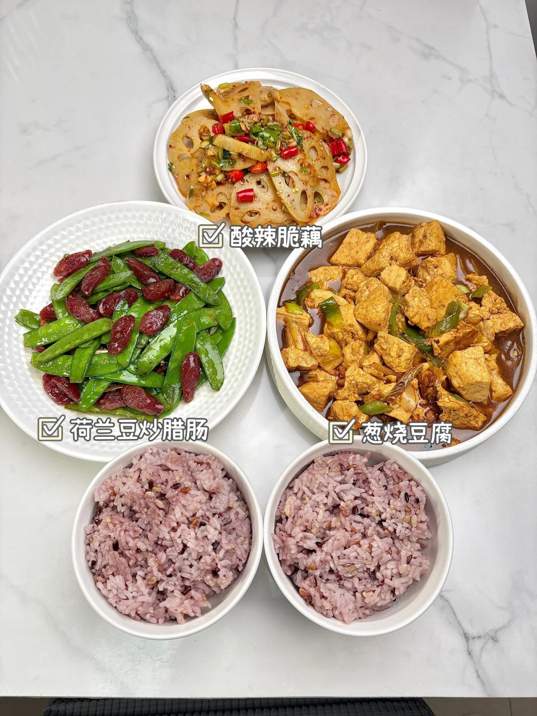 今天晚餐长这样 两人一周不重样下饭家常菜 分享给每天不知道吃什么的小伙伴 主页都有具体的做法哦! 1️⃣锅包肉、番茄炒蛋、蚝油生菜 2️⃣荷兰豆炒腊肠、酸辣脆藕、葱烧豆腐 3️⃣年糕烧鲳鱼、杏鲍菇炒牛肉、蒜蓉菜心 4️⃣红烧狮子头、水蒸蛋、清炒杭白菜 5️⃣菠萝咕咾肉、酸辣白菜、小葱煎鸡蛋 6️⃣蒜苔炒肉丝、炸酥肉、油焖茭白 7️⃣凉拌儿菜、蒜香孜然鸡肉粒、清蒸鲈鱼 好好吃饭,认真生活[红色心形R][红色心形R]