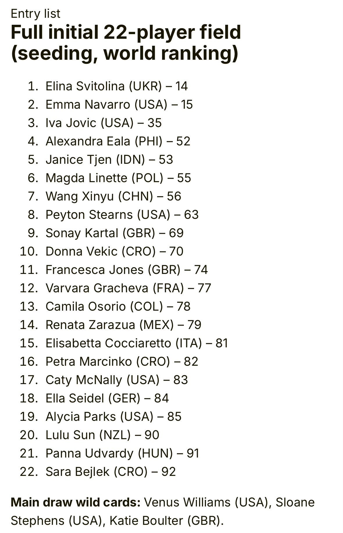 2026奥克兰赛阵容:外卡:大威、斯蒂芬斯、博尔特NO.14斯维托丽娜NO.15纳瓦罗NO.35约维奇NO.52伊埃拉NO.53曾丽美NO.55里内特NO.56王欣瑜NO.63斯特恩斯NO.69卡塔尔NO.70维基奇网坛风云