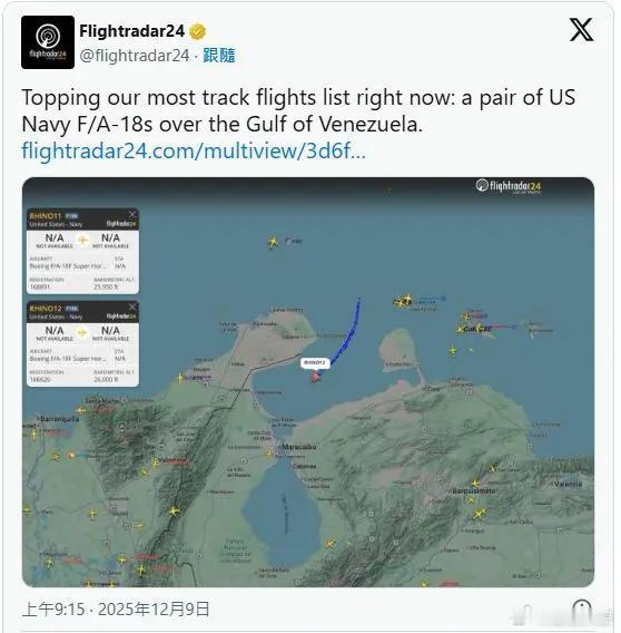 军闻网站“The War Zone”引述“Flightradar24”资料指出,这两架美国海军战机于12月9日中午飞入委内瑞拉湾中心区域,在委内瑞拉领空盘旋约40分钟后向北离开。“The War Zone”认为,此举显示川普政府对马杜罗政权的“极限施压”再度升级。