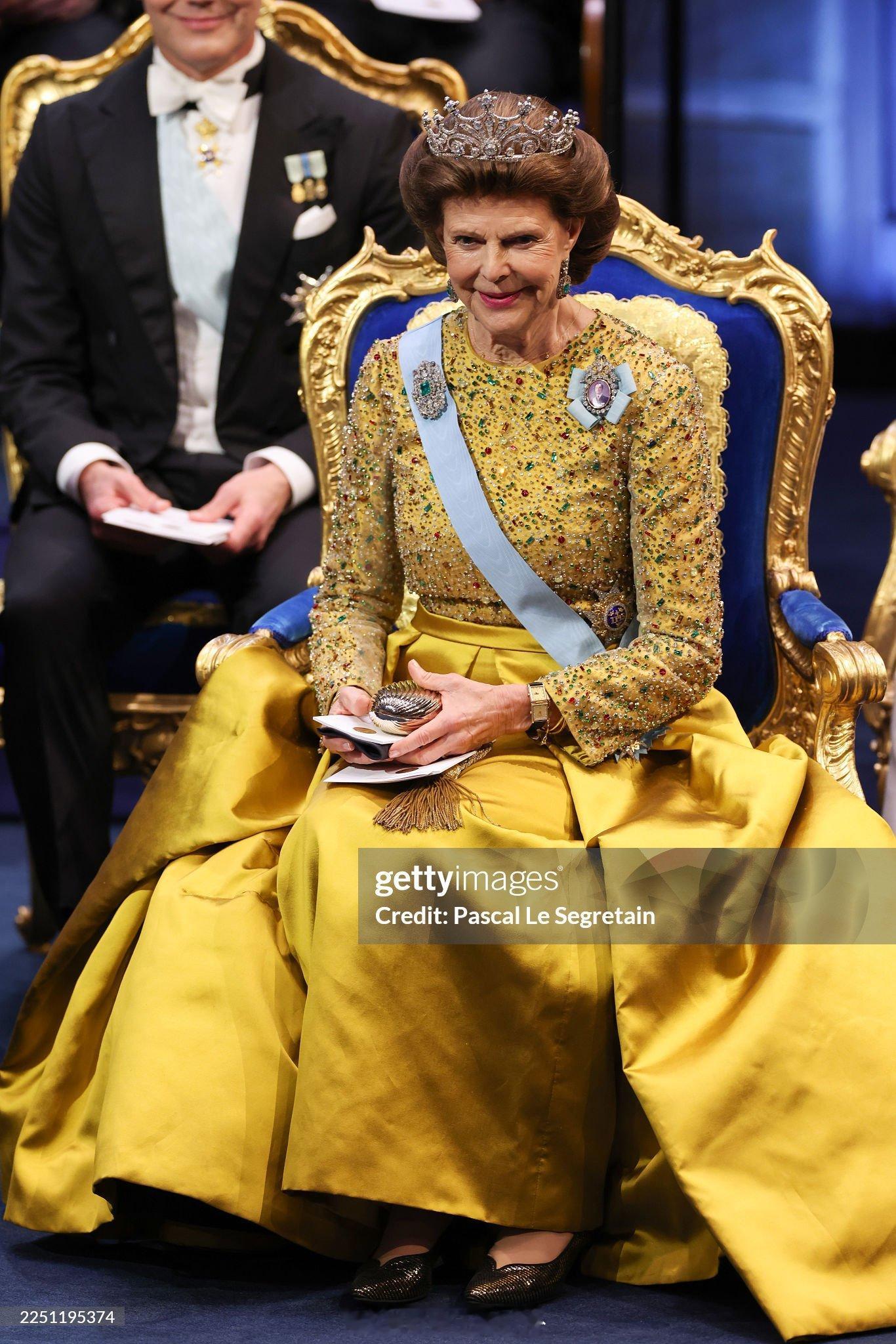 12.10 瑞典王室成员出席一年一度的诺贝尔奖颁奖礼,速报。母女仨全部穿旧礼服,其中维多利亚的礼服西尔维娅在21年前穿过