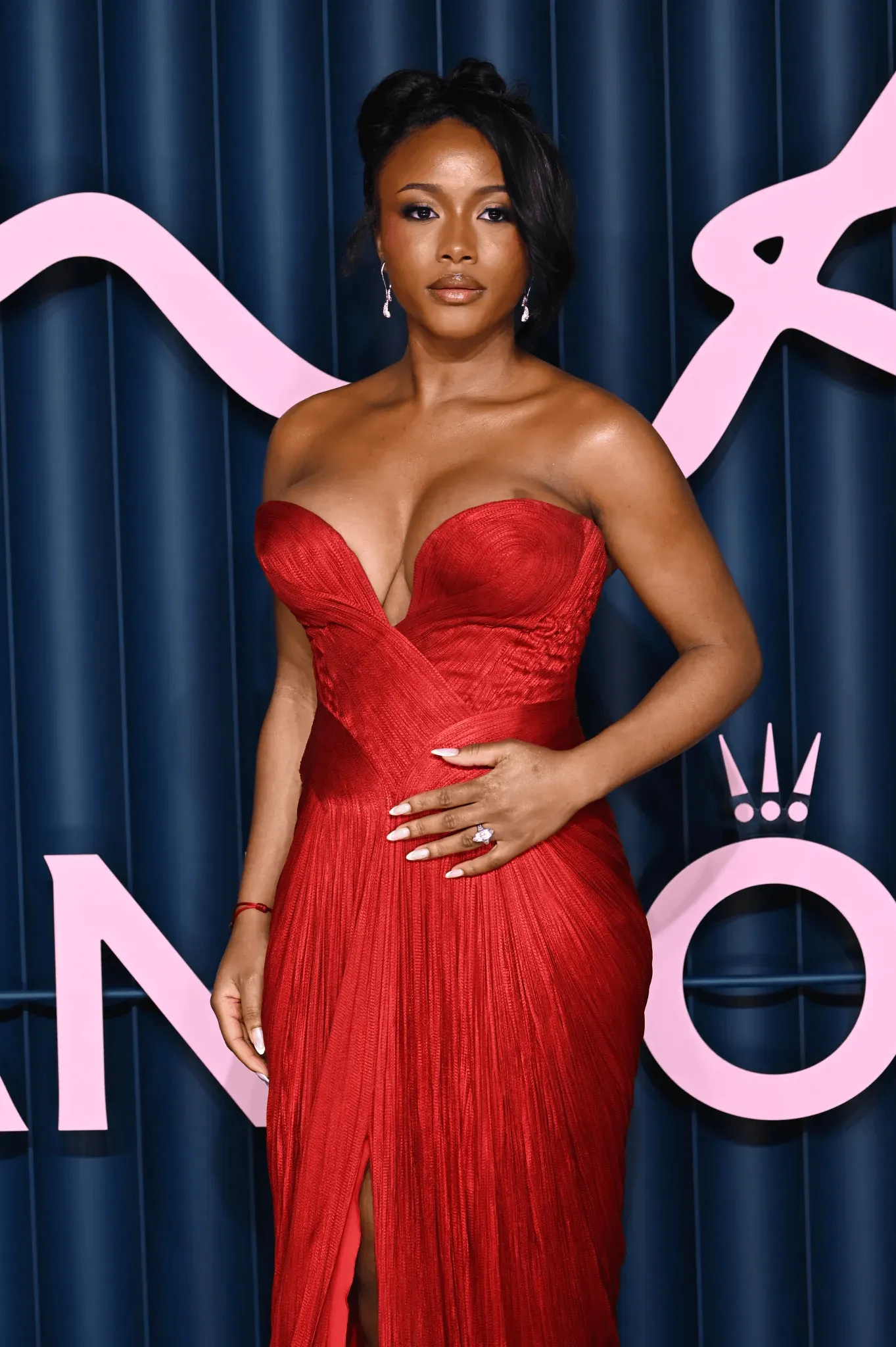 萨卡未婚妻身穿深V红裙,亮相英国时尚大奖现场