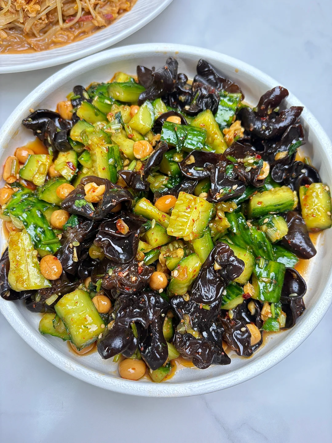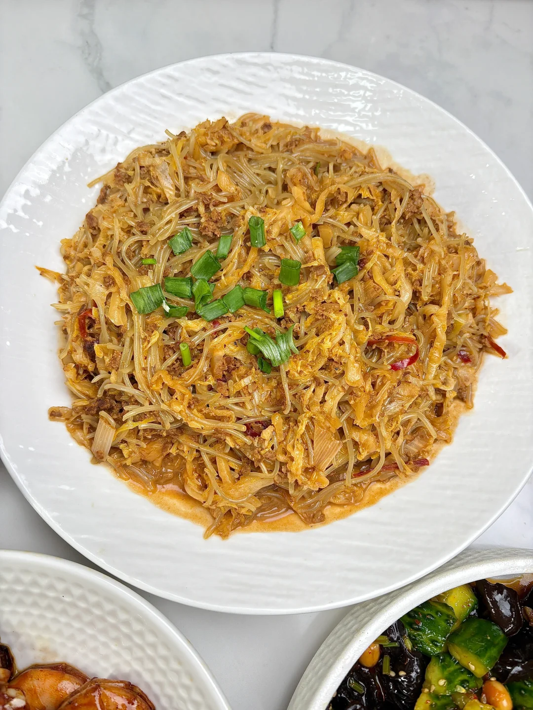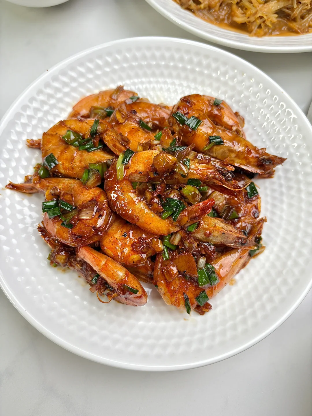 今天晚餐长这样 今日菜单: 肉末酸菜炖粉条 油焖大虾 凉拌黄瓜木耳