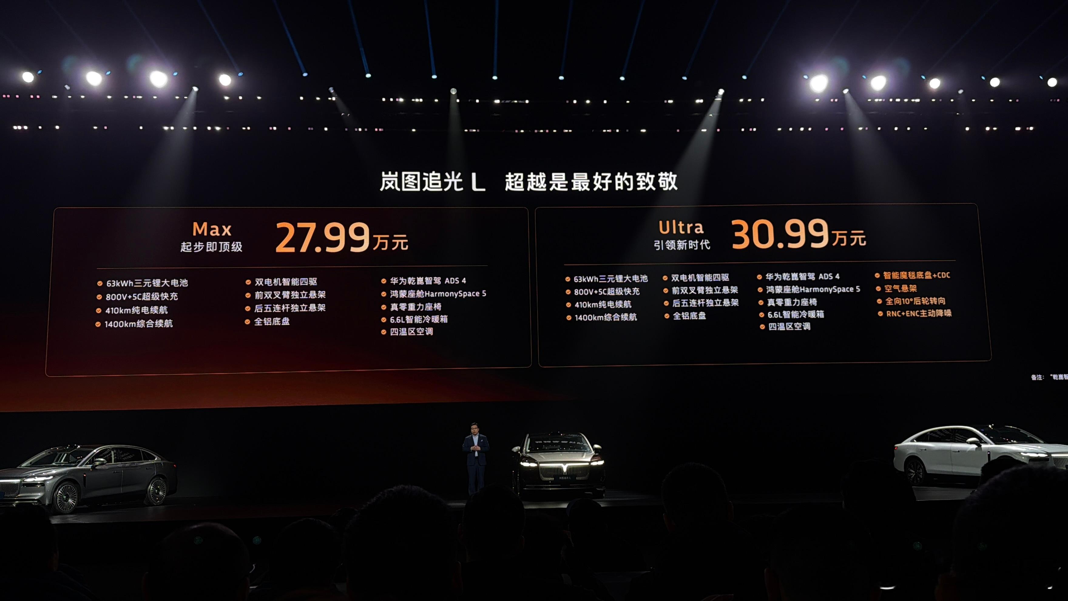 27.99万起岚图追光L压轴上市30万级豪华轿车首选岚图追光L破晓而来,标杆新生!岚图追光L正式上市,Max版27.99万元、Ultra版30.99万元。首任车主享价值5.2万元六大无忧权益行业唯一!全域800V+5C超充+63kWh大电池,配齐华为乾崑智驾ADS 4.0与鸿蒙座舱5.0,百万级底盘+智能四驱,驾控与舒适皆巅峰岚图三旗舰拼图圆满,以硬核科技诠释豪华新境,为中国精英开启高端出行新时代。这一次,标杆由我们定义! 北京·北京奥林匹克公园