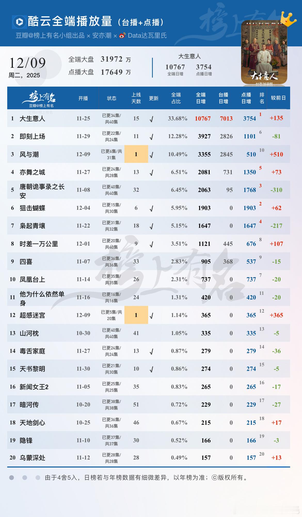 12.9酷云播放量🌴豆瓣榜上有名小组出品1 大生意人 全端日冠×11,全端破亿×2; 10767 点播端3754新高 +1352 即刻上场 3927 1101 -813 风与潮首日 全端3355 点播端510万4 亦舞之城 2081 1350 +735 唐朝诡事录之长安 2063 1768 -3106 狙击蝴蝶 1903 +627 枭起青壤 1647 -2178 时差一万公里 1121 676 +1079 四喜 905 537 -1510 凤凰台上 737 -2011 他为什么依然单身 12 超感迷宫 首播 365 13 山河枕 14 毒舌家庭 15 天书黎明 16 新闻女王2 17 暗河传 18 天地剑心 19 隐锋 20 乌蒙深处 大生意人连续15天上涨