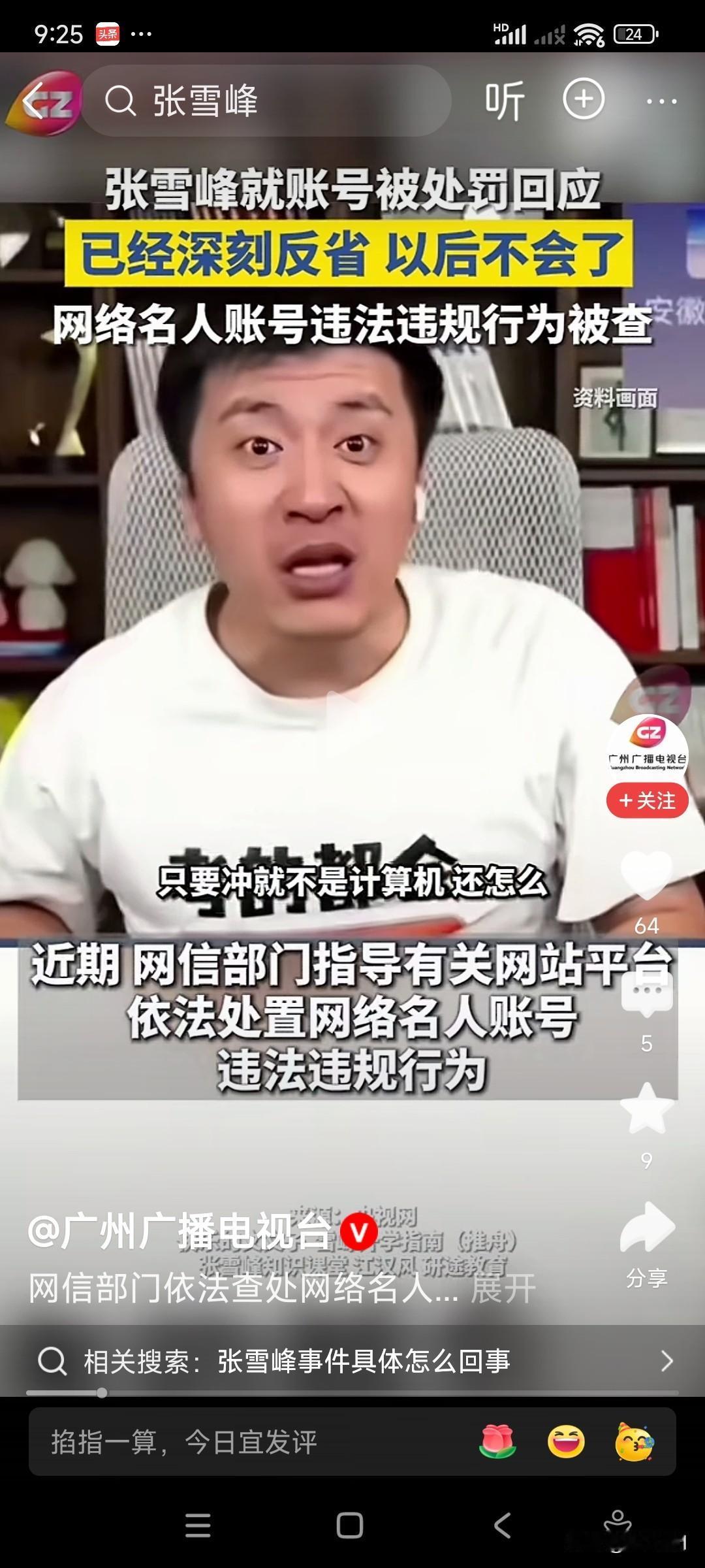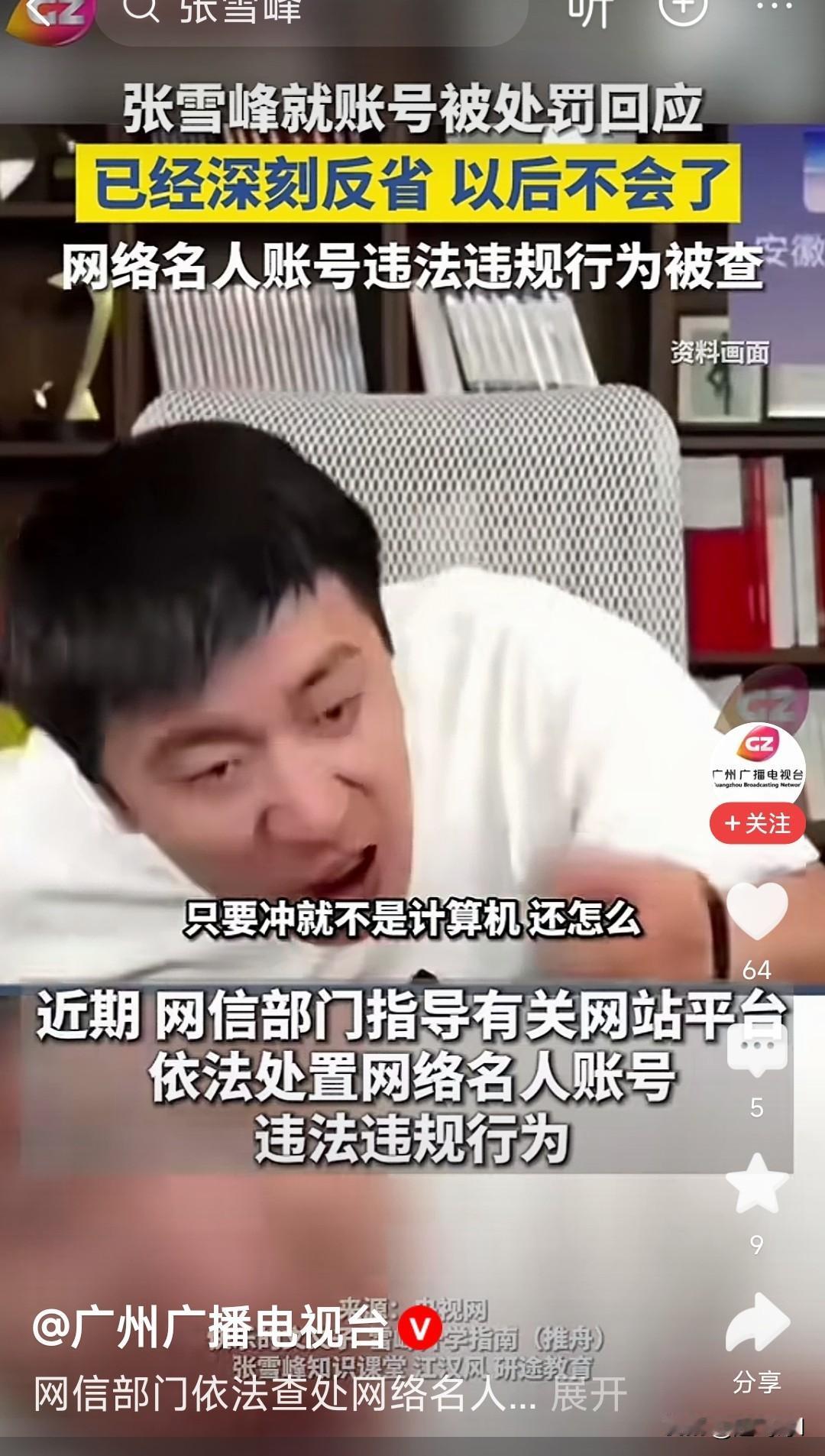 张雪峰是有点飘了,我都看他多年了,他确实帮助了不少家庭解决了不少问题,现在看他和以前确实不一样了,直播的时候不看公屏,低着脑袋连线,别人也不知道他干什么呢?连线的时候也不知道能不能听到别人说话,给人不尊重的感觉,说话的时候阴阳怪气,大呼小叫,不能好好说话,有时语言过激,好像别人都在求他。 你也是来挣钱的,挣钱就要服务态度好点,没有必要大呼小叫,给别人太难受了,必定是直播有很多人看着你呢,直播就要规范,语言和坐姿都要正规。 张雪峰被网信办治理了,账号被封停播一段时间,网络非法外之地,张雪峰及时认识到自己的错误,在平台上也向大家道歉了,进化平台的文明直播。