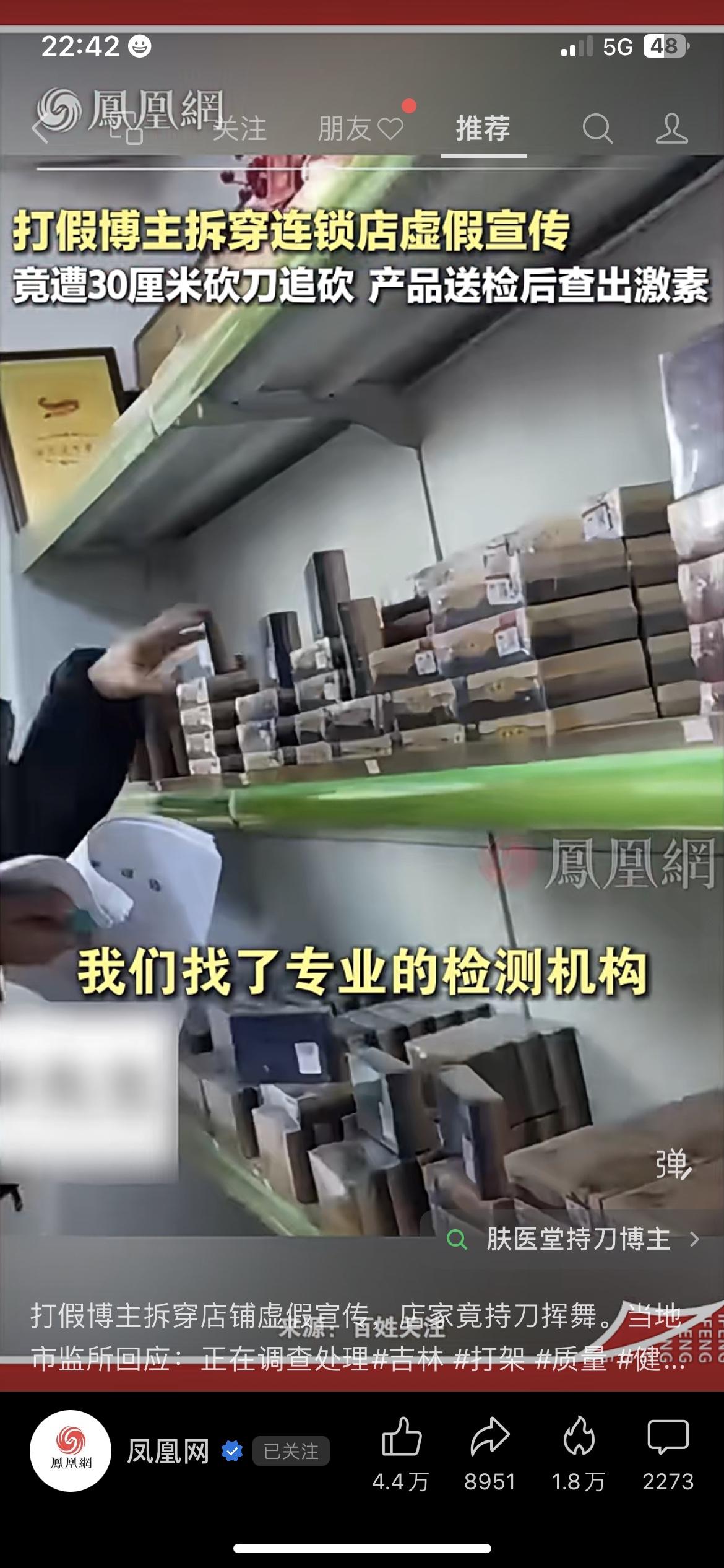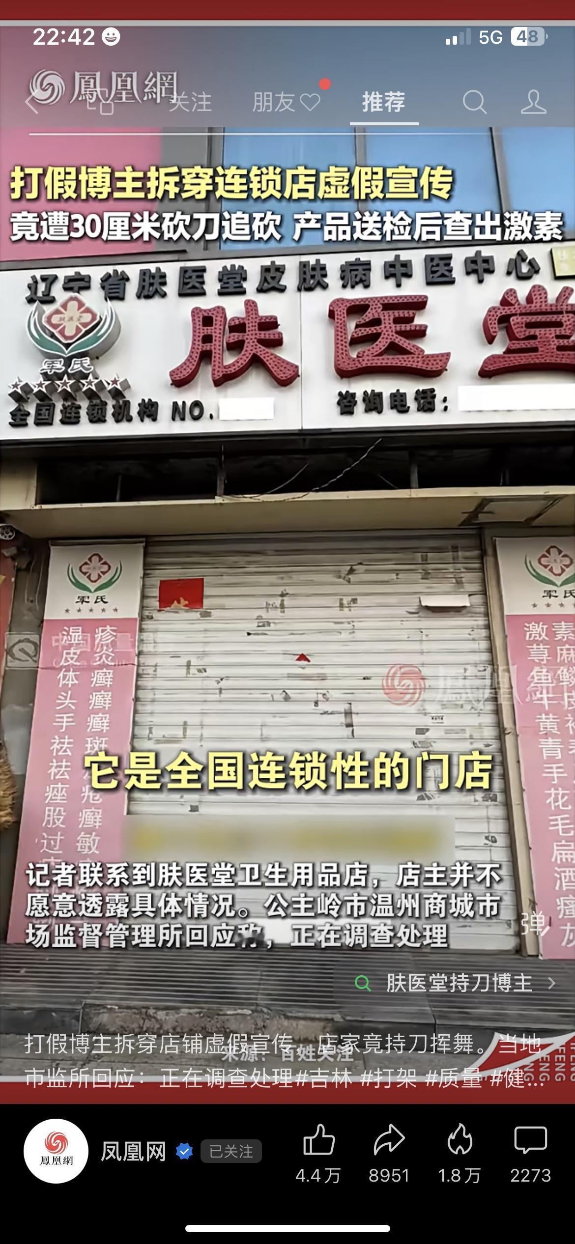 4000家连锁肤医堂被查出激素!打假博主遭砍刀追砍太吓人 刚刷到肤医堂打假这事儿真的后背发凉!咱普通人皮肤不舒服去连锁门店调理,本来图个放心,谁能想到肤医堂多款产品送检,查出含氯倍他索丙酸酯、咪康唑等西药成分,包装却只标中药,涉嫌虚假宣传。打假博主曝光后去门店沟通,店主直接拿30厘米长刀追砍,万幸躲避及时没受伤,目前涉事店主已被行拘5日罚200元,市监部门也已立案调查。说实话,咱平时去这类保健、皮肤门店消费,真得多留个心眼,先查资质再买产品,别轻信夸大宣传,不然花了钱还伤身体太不值了。 你身边有见过这类问题门店吗?唠唠你平时咋避坑的?中医打假