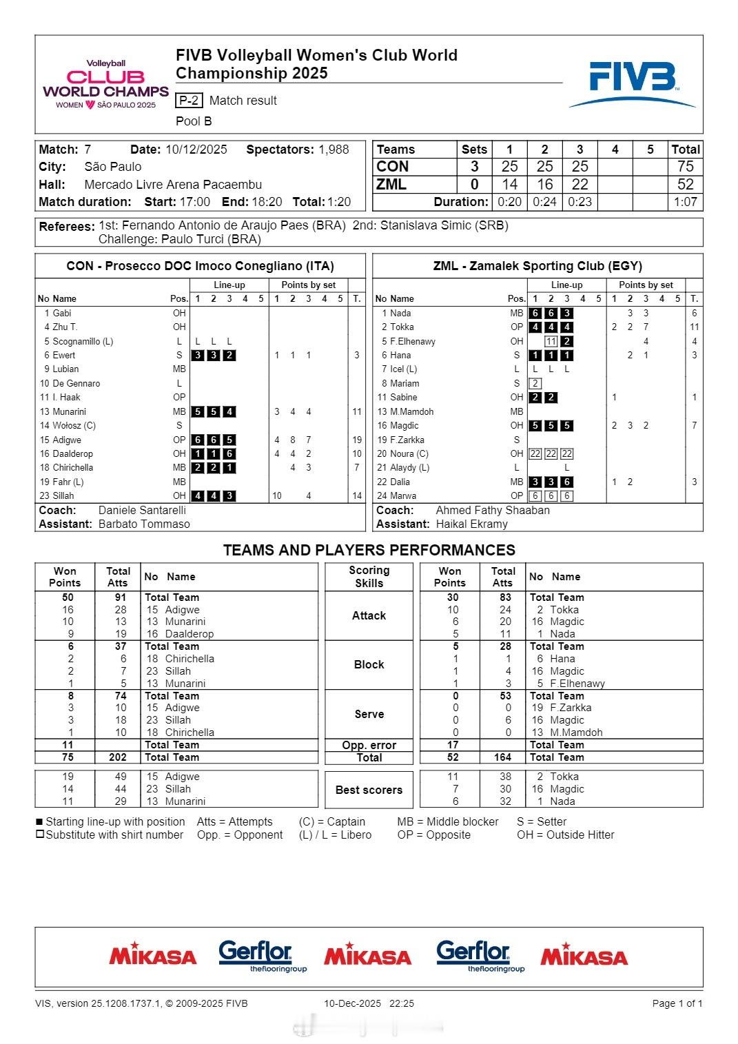 【女排世俱杯科内替补出战轻取两连胜 携手海滩提前进四强】国际排坛战报速递 12月10日巴西圣保罗,2025女排世俱杯B组,意大利科内利亚诺替补出战以3-0(25-14/25-16/25-22)轻取埃及扎马雷克,与同为两连胜的巴西海滩提前一轮晋级四强。阿迪维19分、西拉14分、穆纳里尼11分、达尔德罗普10分、沃沃什、哈克、加比、朱婷和德吉纳罗全部休战,托卡11分。