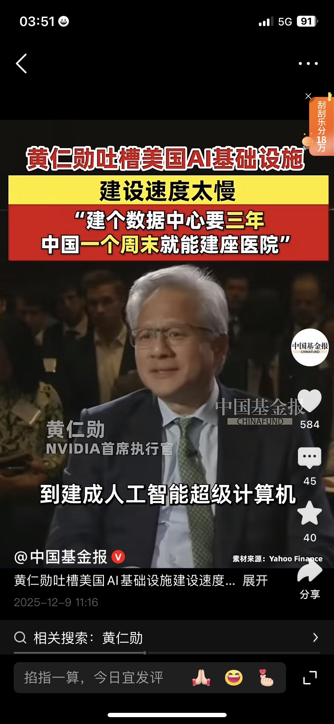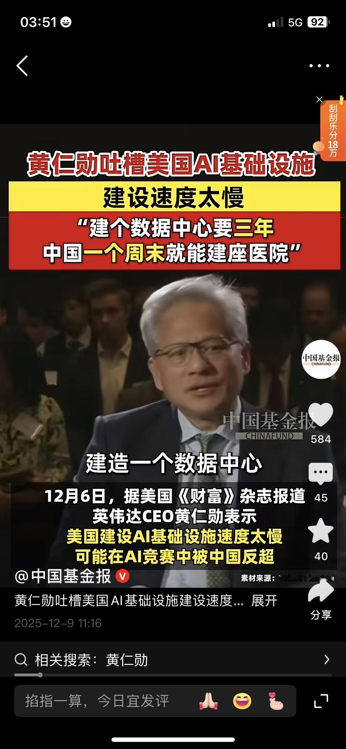 黄仁勋这话,算把美国基建“扒光”了? 今天刷到黄仁勋吐槽美国AI基建,给我乐坏了:“美国建个数据中心要三年,中国一个周末能起座医院”——这话够扎心不? 咱说啊,老黄作为英伟达大老板,那是真懂行:AI这东西拼的就是速度,你基建慢半拍,算力、项目全得卡脖子。咱国内那“基建速度”,这下算是让国际大佬都认账了!黄仁勋定律