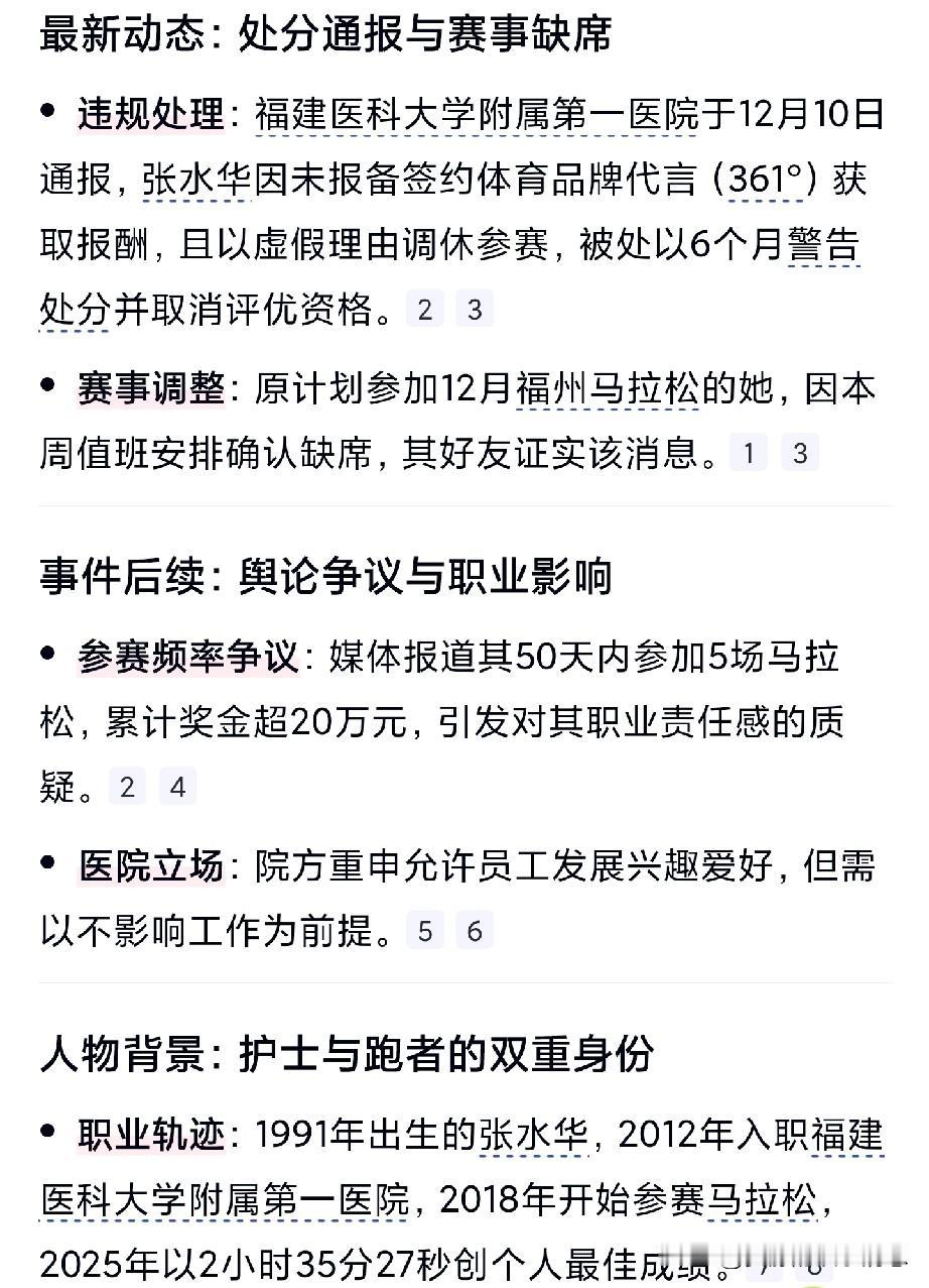 这次张永华护士安排没去马拉松,还被警告处分,这事儿为什么会闹成这样呢? 其实就是人际关系处理不好造成的。虽然你平时训练很刻苦,能在比赛中获奖大家都为她高兴,但她每次去马拉松就是请假让其他同事辛苦。 现在她跑出成绩后只顾自己高兴,对同事却只说一句辛苦了,谁听了心里都不舒服。 但凡情商高一些,会一点人情世故,估计同事们心里的不平衡也就没有了。职场中最重要的是处理好人际关系,吃水不忘挖井人,搞好关系,少些摩擦和烦恼,何乐而不为呢?