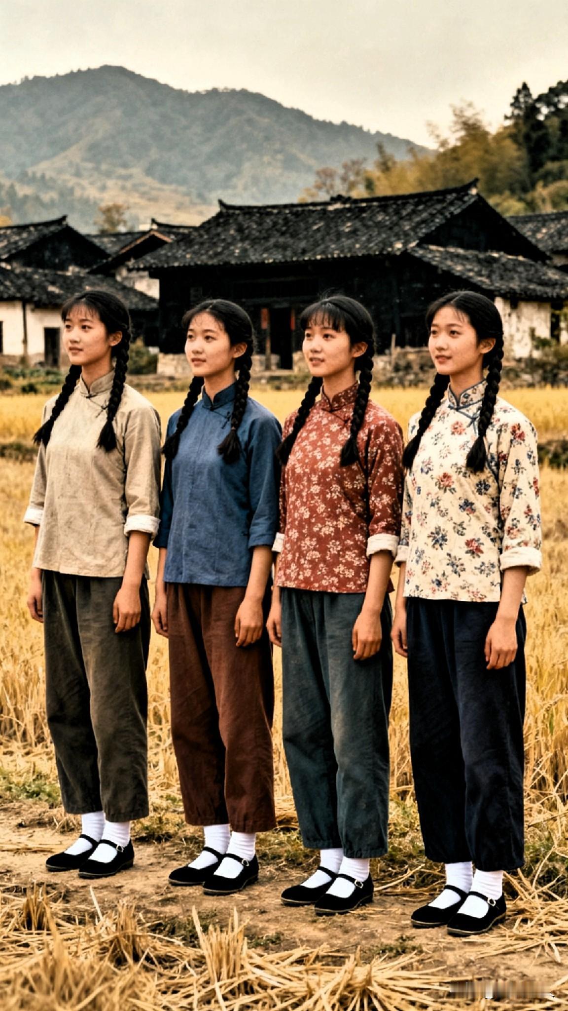 四个姐妹出在哪个年代,说出你的编号是几? 高清美女 民国四姐妹 四姐妹照 姐妹留影 看到这张照片,仿佛时光突然慢了下来。四个姑娘,梳着整齐的麻花辫,穿着素净的盘扣上衣和宽松裤子,脚踩黑布鞋,并肩站在一望无际的金黄稻田前。身后是青瓦老屋,远山如黛,整个画面笼罩在温暖怀旧的光晕里。 这瞬间,太有故事感了。她们的眼神清澈,笑容腼腆,身上带着一种现在难得一见的质朴与朝气。这分明是上世纪六七十年代,中国乡村最常见的景象。那个年代,没有眼花缭乱的时装,一件干净的中式上衣就是最美的装扮;没有精致的发型,两根乌黑的麻花辫就是青春的象征。 稻田是她们的背景,也是她们的生活。我猜,她们或许是刚干完农活结伴回家,或许是生产队里的好姐妹。那种并肩而立、眼神里充满希望的样子,隔着屏幕都能感受到一股蓬勃的生命力。那样的纯真年代,简单、辛苦,却充满了人与人之间最真挚的情感连接。 如今,这样的画面已成记忆。老屋可能翻新,稻田或许已变样,但照片定格的那份美好,却瞬间击中了我们内心最柔软的地方。那是对一个时代的集体回望,也是对那份单纯与热忱的深深怀念。 来说说,你觉得这张照片拍于哪个年代?四个姐妹中,最打动你的是谁?按从左到右顺序,把你的“编号”留在评论区吧!我是1号,因为她眼神里的坚定,像极了我的外婆。 老照片里的故事 时光记忆