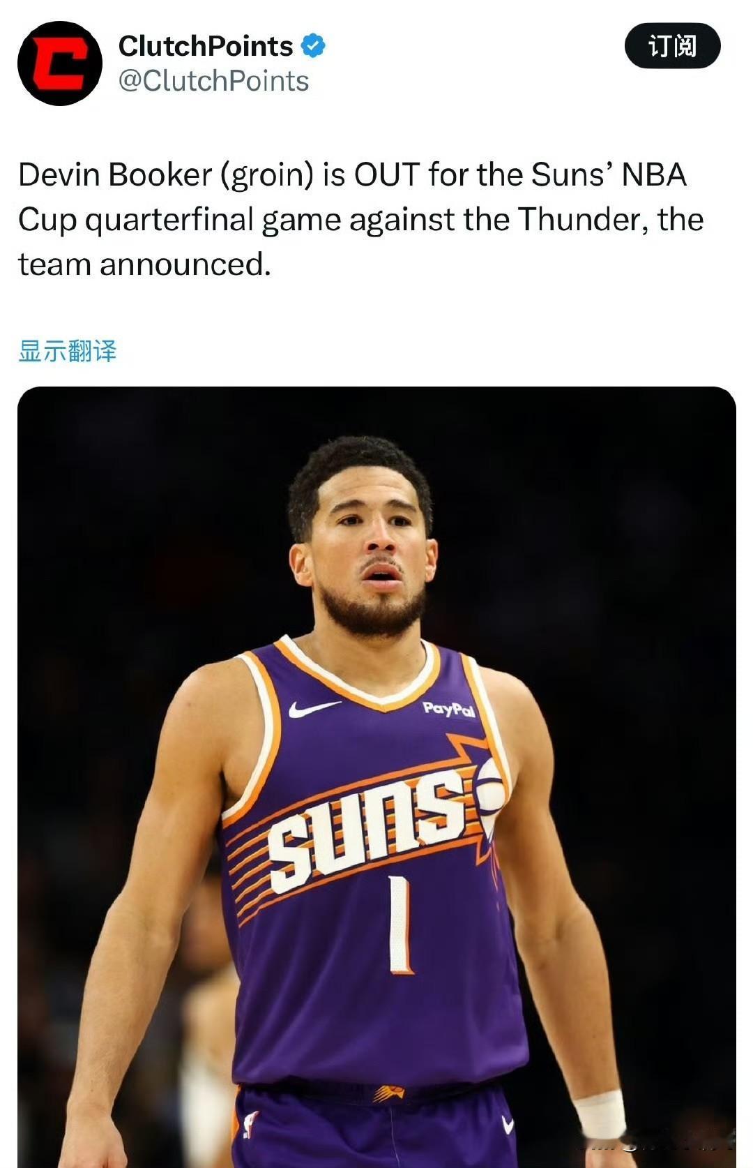 打也打不过,索性不打了!!!布克缺席今日对阵雷霆的比赛! 根据外媒最新消息透露,太阳当家球星布克因遭遇了腹股沟伤病将不会出战今天客场对雷霆的比赛。 这还打什么,反正也打不过,那就不打了吧……当然不是这样,球员的伤病健康还是第一,不能贸然复出,就像马刺的文班亚马一样,他今天也不会出战。 而且太阳在没有布克的情况下也不是不能打,有狄龙在就还是很有看点和机会的,雷霆确实很强,但是比赛要看临场发挥,太阳现在的风格并不惧怕打雷霆。 今天是西部的四支球队比赛,两场比赛将决胜出晋级季中赛四强的两支球队,并且还有大额奖金可以拿到,岂不是美哉。 希望布克早日康复,大家记得观看比赛,八点半是太阳vs雷霆,11点是马刺vs湖人。 布克 德文·布克 菲尼克斯太阳队 雷霆