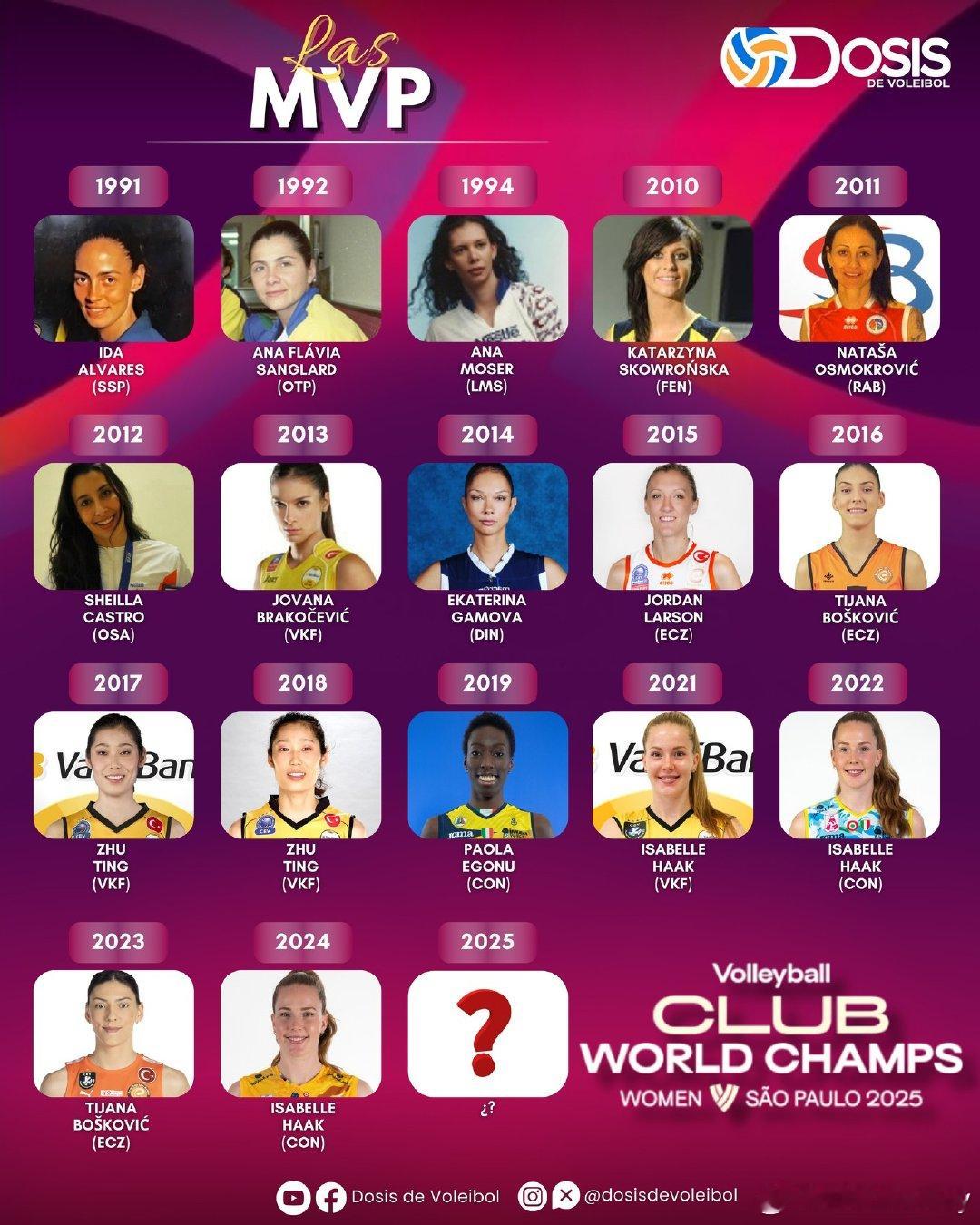 女排世俱杯历届MVP一览图哈克3次,朱婷和博斯各2次,埃格努1次。女排世俱杯 朱婷 朱婷第七次出战女排世俱杯