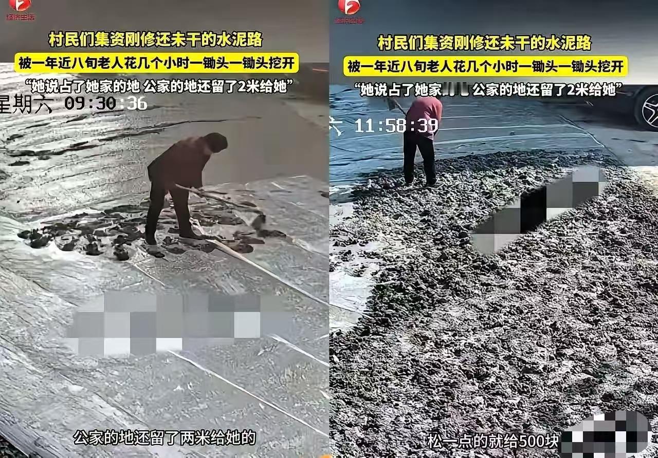 “脸都不要了!”湖南,村民自发凑钱修水泥路,结果水泥还没干,就被 80 岁老太太用锄头花 3 小时全部挖开。 村里之前全是泥坑,雨天出门易摔跤。村民自发凑钱修路,你家三百我家五百,外出年轻人也远程转钱,独居老人都捐了两百。 村民托熟人找修路队,工人连夜铺好路面,路边插了“水泥未干,禁止通行”的警示牌。 第二天一早,老太太扛锄头挖新路。有人阻拦,她称路占了自家地界,没商量必须挖。村民说会按规定补偿,她不听,从早挖到中午,路面被挖得坑坑洼洼。 村民们又气又无奈。修路钱是大家省吃俭用凑的,工钱还没结,重新修要再花钱花时间,直接损失好几万。 网友看视频炸锅。有人说老太太自私,毁了集体利益;也有人猜可能有未解决的纠纷,但极端做法不可取。 农村修路全靠村民齐心协力,是全村的好事。有地界争议,可找村委会协调或走合法途径,破坏公共设施解决不了问题,还得担责。 现在村里人心涣散,没人敢再提凑钱修路。老太太的行为伤了村民心,也提醒大家,集体事需要包容,矛盾别用极端方式处理。 各位读者你们怎么看?欢迎在评论区讨论。