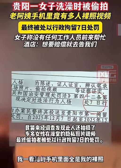 贵州,熊女士去外面洗澡,却在淋浴区,发现一位老年女子偷拍自己,且正准备发送。熊女士立即上前抢夺手机,双方随即发生了争执。经过争夺,熊女士成功拿到手机,发现手机里不仅有她的隐私照,还有其他女性的隐私照,她果断选择了报警。 --- 熊女士当时带着孩子,在贵阳地中海传奇水汇洗完澡冲水时,不小心把水溅到了旁边一位阿姨身上。她转头想道歉,目光扫到对方的手机屏幕,瞬间全身发凉——那上面全是自己洗澡的裸照,而且正显示在微信发送界面。她脑子“嗡”的一声,什么也顾不上,扑过去就抢手机。 两人扭打在一起,过程有十多分钟。熊女士一边要护着身边的孩子,一边拼尽全力去夺手机,场面狼狈又无助。让她心寒的是,她看到不远处就有三个穿红色工服的水汇工作人员,他们只是看着,没有一个人过来制止或帮忙。直到她自己抢下手机并报警,工作人员始终没露面。 警察来了,带走了偷拍的阿姨杨某某。到了派出所,熊女士才知道事情多严重。警察检查手机发现,里面存了好多不同女性的裸照和视频。一段29秒的视频里,三位女士的全裸画面清晰可见,这段视频已经被杨某某通过微信转发给了别人。最后,杨某某因为偷拍、散布他人隐私,被依法处以行政拘留7日。 事情发生后,熊女士找到水汇讨说法。她觉得在自家浴区发生这种事,店家脱不了干系。但水汇方面的处理让她更失望。大堂经理不承认工作人员漠视了十多分钟,辩称“顶多三、五分钟”。提出的解决方案是“免掉本次消费,再送三张门票”。熊女士拒绝了,她要的不是几张门票,是对方正视管理失职的态度。 水汇经理后来对媒体说,如果熊女士要求经济赔偿,那就“走正规法律渠道,该赔多少我们承担”。这话听起来依法依规,可总让人觉得少了点对顾客遭遇的共情和歉意。工作人员在场却未干预,这管理责任能撇清吗? 这种糟心事不是个例。就在前两天,重庆一家温泉酒店也出事了,一男一女合伙在女更衣室偷拍,直接被警察刑事拘留了。这说明,偷拍在澡堂、更衣室这类地方,真不是极端个案。 针对这些行为,法律一直在完善。今年新修订的《治安管理处罚法》明确规定,偷拍、窃听、散布他人隐私,最高可处十日拘留。国家出台的《公共安全视频图像信息系统管理条例》更是划了红线,把公共浴室、更衣室、卫生间内部这些地方,明确列为禁止安装摄像头的“法律禁区”。 说回熊女士的遭遇,她勇敢抢下手机并报警,保护了自己,也阻止了照片流出,非常果断。但事后维权确实心累。律师指出,如果场所管理方存在没有及时制止等过错,是需要承担相应责任的。受害者也可以向法院起诉偷拍者,要求赔礼道歉和赔偿精神损失。 我们去浴室、酒店这类私密场所消费,买的不只是服务,更是一份安心和安全。店家把“走法律程序”挂嘴边没错,但事发的及时处理、事后的诚恳态度,更能看出把顾客当回事的真心。总不能指望每个顾客都像熊女士一样,得自己冲上去搏斗吧?管理到位,才是杜绝隐患的根本。