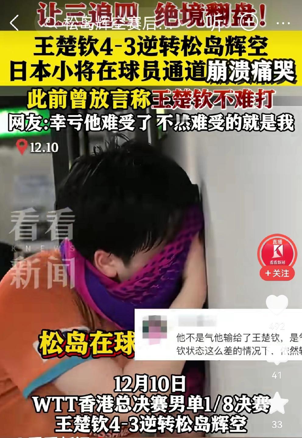 输给王楚钦后,松岛辉空崩溃痛哭[流泪] 昨晚,男单1/8决赛,焦点之战就是国乒一哥王楚钦和日乒18岁小将的比赛。 王楚钦,一日两战,以劳待逸,最终让三追四,逆袭成功。 松岛辉空,在大比分3:1的利好形势下,被王楚钦逆转。 比赛结束后,松岛辉空在球员通道,崩溃痛哭,哭得撕心裂肺。 这孩子,曾经战胜过王楚钦,近期状态极好,曾经扬言:王楚钦不难打! 可是,这场球打下来,王楚钦太难打! 国乒一哥王楚钦,是拦在他和日乒男单面前一座不可撼动的山! 小子,莫哭!回去好好练球吧! 赛场硬核王楚钦