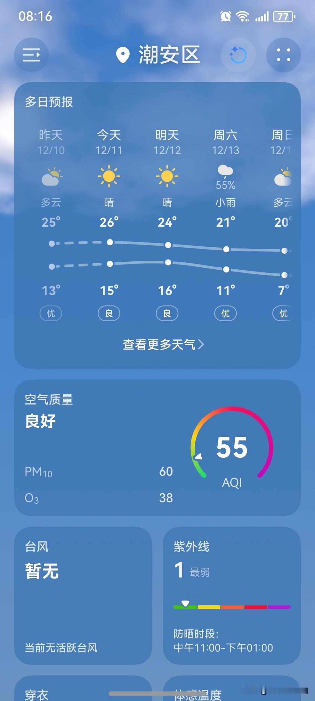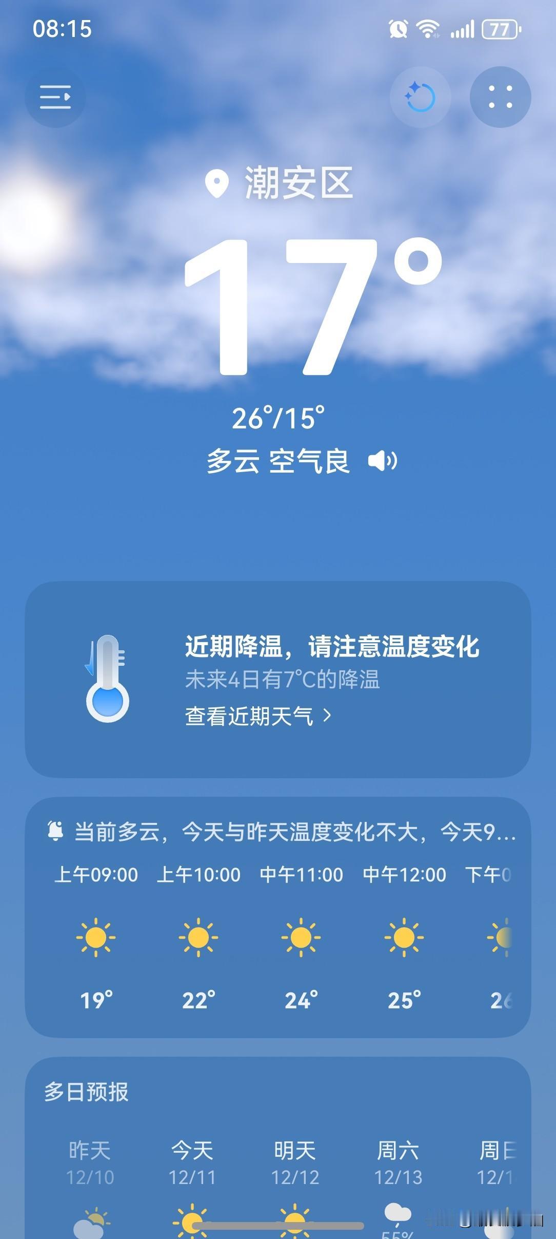 寒潮继续影响我国大部地区,带来大风、降温天气! 全国初雪地图新鲜出炉!我国中东部将迎立冬后最大范围雨雪,华北、黄淮部分地区有大雪或暴雪,太原、北京、天津等城市或现初雪,南方多地有小到中雨,局部大雨。 广东本周末将迎降温降雨双重夹!今天(11日),粤西、珠江三角洲地区云量增多,有分散的零星小雨;12日,受西风槽影响,清远、韶关和珠江三角洲北部市县有小到中雨;北方新的一股中等偏强冷空气前锋将于12日夜间到达南岭,清远及韶关的北部市县气温率先下降,受冷空气影响,13~14日我省有一次小到中雨降水过程。 今天(11日),潮州依然喜提一个多云天气,气温15~26℃,此刻气温17℃,体感温度16℃。 看看今天的天空,云量相比昨天又多了一些,太阳也偷懒不上线营业了,说好的拼业绩呢?咋啦?拼不动了吗?卷王果然是不好当的! 早上虽然没有阳光,但白天的气温还是比较高的,今天的全天最高气温再度上升,喜提26℃,又是暖意融融的一天呢! 现在的气温有多高,周末的降温就有多狠!不敢想象到时候有多酸爽,反正一顿挨冻是少不了的。 不说了,先提前准备一下厚衣服和厚被子御寒吧!千万别等冷空气来了冻着了再哀嚎:“哆啰啰,哆啰啰,寒风冻死我,明天就做窝。” 毕竟寒号鸟的下场不大美妙啊! 趁着这两天的天气暖和,把该准备的东西准备好了,别等天寒地冻的时候才想起来,到那时,天气寒冷,冻手冻脚的,什么活都不想干了! 最后,还得给今天的天气做一下总结:今天的天气,从整体来讲,依然值得一个五星好评! 如此天气!元芳,你怎么看? [捂脸][强][笑哭][我想静静][捂脸][强][笑哭][我想静静]