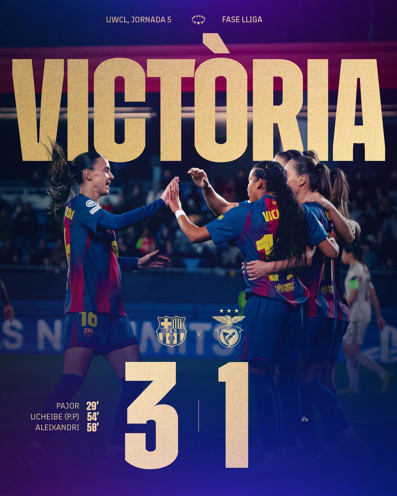 红蓝倩影 🏆女足欧冠联赛阶段第五轮,巴萨女足坐镇主场迎战本菲卡!上半场帕约尔首开记录,下半场对手扳平比分后送上乌龙大礼,拉娅破门扩大比分!最终姑娘们3-1战胜对手,汉森当选全场最佳球员,而巴萨女足依然在本赛季欧冠保持不败!巴萨 🔴🔵ForçaBarça