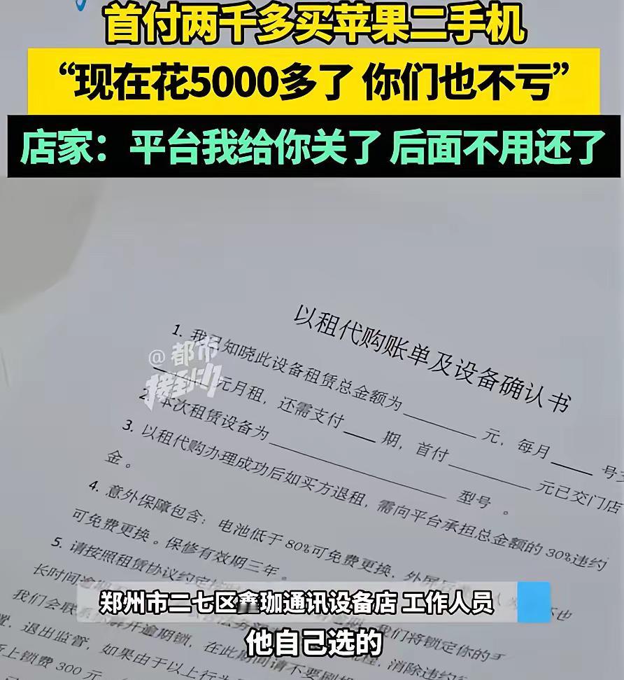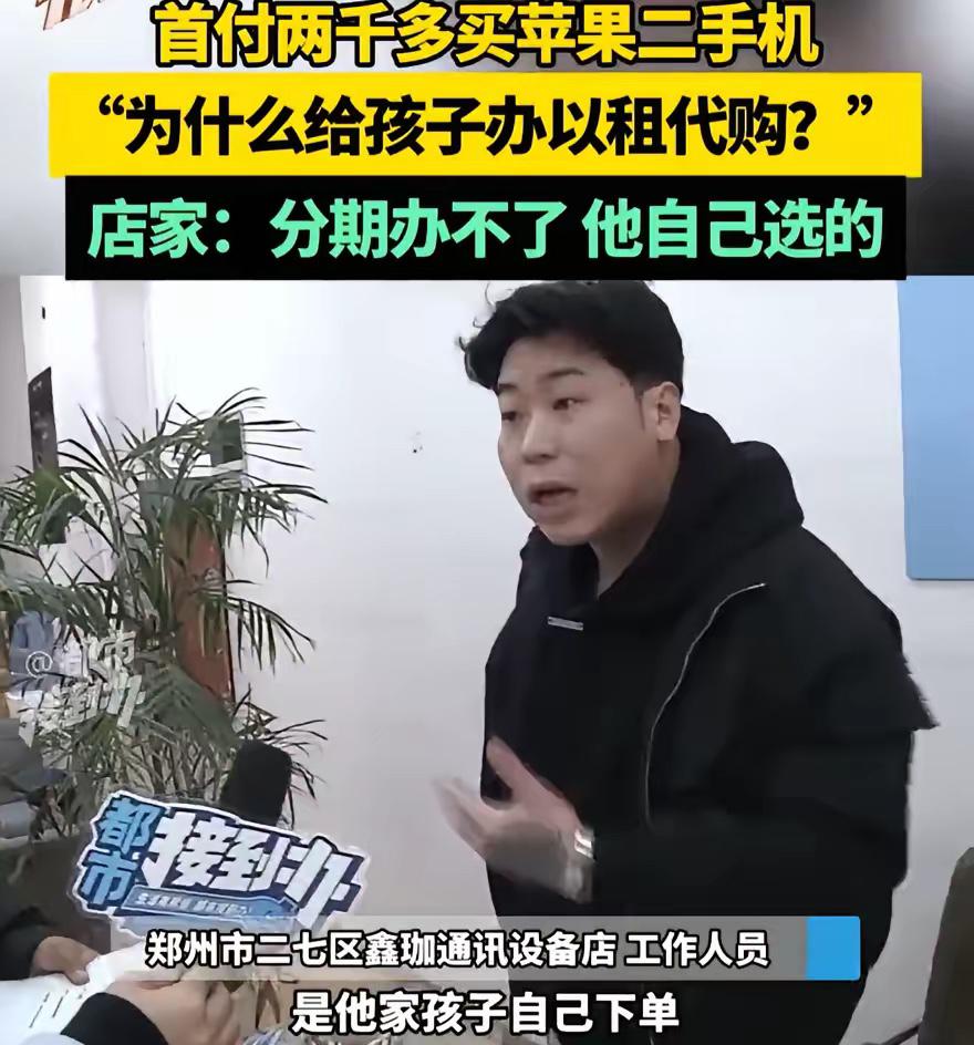 “这不是坑人吗?”河南郑州,一名18岁男孩刚成年,想要买一台苹果手机,结果自己去了手机店,糊里糊涂花一万多买了台二手苹果14 pro max,父亲得知后直接到店里讨说法,店家却表示:没人拿刀逼他办理业务,全部是自愿的。 孩子手里攒了两千多块钱,做父亲的心里疼孩子,又给他添了一点,凑够四千块,觉得买台手机足够了。谁想到孩子独自进店,一番沟通下来,原本的全款购买计划,在店员的推介下变成了一种叫“以租代购”的方式。 他先付了2200元首付,剩下的钱要分八期来还,加起来总共要付10260元。而这台二手苹果14 Pro Max的市场行情价大概在四千元左右。里外里多花了六千多块,这差价实在太吓人了。 父亲听到一万多块买个二手手机非常气愤,跑去店里理论,店家的态度却非常强硬,反复强调孩子已经年满十八岁,要对自己的行为负责,并且所有手续都是孩子自愿办理的,没有人强迫他。店家说因为分期购机办不了,才办理了“以租代购”。 经过一番沟通协商,店家最终同意后续的费用不需要偿还了,手机由父亲自行处理。 “以租代购”这种模式对社会经验不足的年轻人来说,只让他们看到低首付的诱惑,忽略了总价。年轻人追求时尚可以理解,但在面对复杂的社会环境时需要多一分冷静。 家长们在给予孩子自主空间的同时,要及早帮助他们建立对社会复杂环境的警惕性,了解市场行情,避免因信息不对称而遭受损失。 各位读者你们怎么看?欢迎在评论区讨论。
