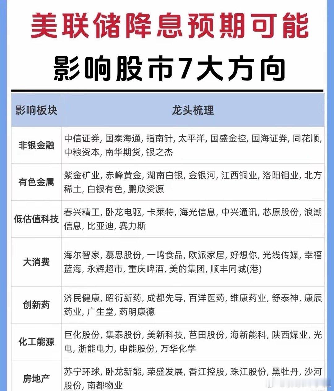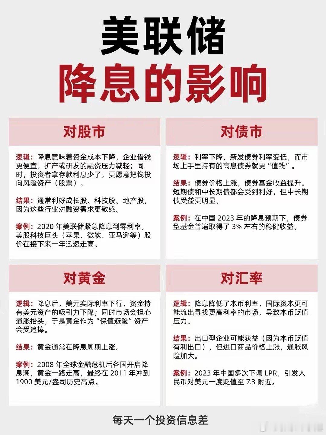美联储降息的整体影响和对股市具体板块的潜在机会:一、美联储降息的宏观影响美联储降息是全球金融市场的重要变量,其影响主要体现在以下四大类资产:1. 对股市:利好,尤其是成长股- 逻辑:降息 → 融资成本下降,企业扩张更容易;存款利息降低 → 投资者更倾向投资股票等风险资产。- 结果:股市整体受到提振,特别是成长性强的科技公司。- 案例:2020年美联储降至零利率,苹果、微软、亚马逊等美股科技巨头股价快速上涨。✅ 投资启示:降息环境通常有利于股市,尤其是高成长、高估值行业。2. 对黄金:通常是利好,价格易涨- 逻辑:降息 → 美元实际利率下降,持有美元资产吸引力下降;同时市场可能担忧通胀 → 黄金作为避险和保值工具受青睐。- 结果:黄金价格在降息周期中往往上涨。- 案例:2008年金融危机后全球降息,黄金价格一路上涨,2011年达到历史高点1900美元/盎司。✅ 投资启示:若预期降息持续,黄金及相关ETF可能是不错的避险配置。3. 对债券:价格上升,债券基金收益提升- 逻辑:利率下降 → 新发行债券利率更低,已发行的高息债券更值钱 → 债券价格上涨。- 结果:债券基金收益通常会提升,中长期债券受益更明显。- 案例:2023年中国在降息预期下,债券型基金平均收益约3%左右。✅ 投资启示:降息前期和中期,债券是相对稳健的配置选择,尤其是中长期债券基金。4. 对汇率:本币承压,可能贬值- 逻辑:降息 → 本币利率下降 → 国际资本流出,流向高息货币或资产 → 本币贬值。- 结果:出口企业受益(因本币贬值提升竞争力),但进口成本上升,可能推高通胀。- 案例:2023年中国多次下调LPR(贷款市场报价利率),人民币对美元一度贬值至7.3。✅ 投资启示:汇率波动会影响进出口企业盈利,关注出口导向型公司以及外汇对冲策略。二、美联储降息预期对股市7大板块的影响第二张图聚焦于美联储降息预期下,可能受益的7个A股板块及对应龙头股,为投资者提供了具体的布局方向:🔍 综合分析与投资启发:✅ 总结核心逻辑链:美联储降息 → 全球流动性增加 + 资金成本下降 → 推动资金流入股市、黄金、债券等资产 → 利好成长股、资源股、地产、消费及创新药等多个方向📌 对投资者的建议方向(可重点关注):1. 科技成长板块(尤其是低估值科技+非银金融)- 降息直接利好融资成本敏感型企业,比如科技、券商、保险等。2. 黄金与有色金属- 降息环境下,抗通胀与避险需求推动黄金、白银、铜等价格上涨。3. 大消费与房地产- 降息有助于刺激内需和购房需求,消费板块和地产链可能迎来修复。4. 创新药与化工能源- 创新药企受益于融资环境改善和估值修复;化工能源则可能因经济预期回升而反弹。特朗普嫌降息幅度太小美联储2025年第3次降息美联储降息影响