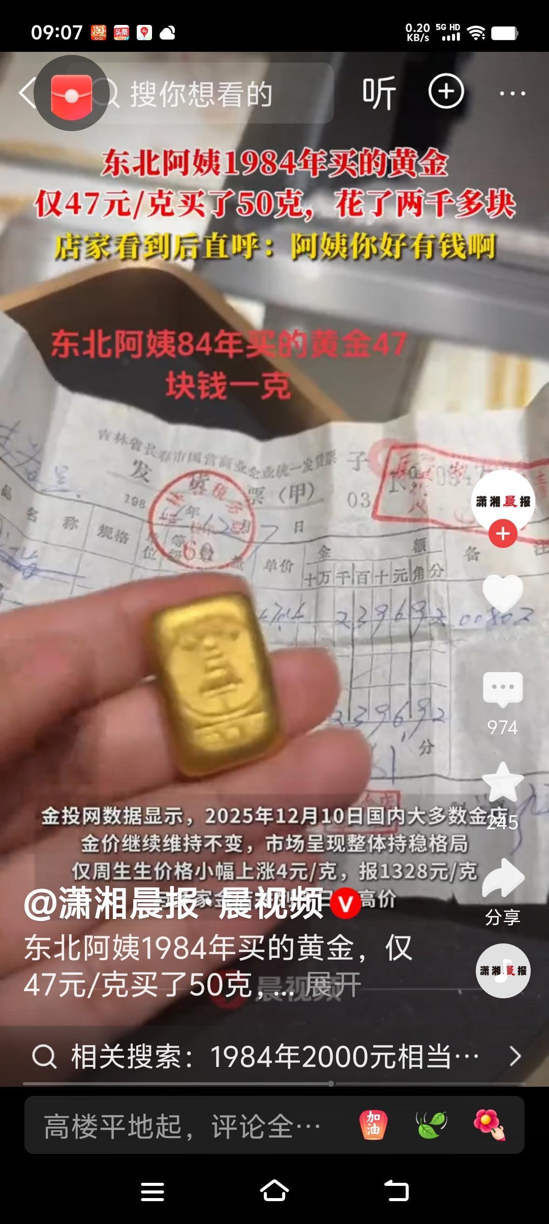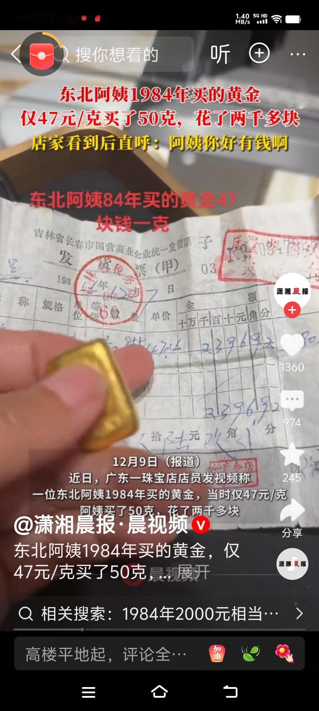 东北大妈这回赚麻了! 因为东北大妈来到金店买黄金! 广东一金店迎来一位东北大妈,大妈是在1984年买的一小块金砖,金砖50克,当时收据完好无损,1984年黄金售价47块多一克,50克花去2300多元,现在大妈要出售50克黄金,店员都惊呼大妈在1984年就好有钱!现在出售会赚很多。 如果按每克1000左右来计算,会卖50000左右,东北大妈真是赚大发了! 可是有人又给大妈算了一笔账: 84年工资几十块,如果按50算,假如大妈当年买黄金花了2000元,这就相当于花去就是40个月工资。现在金价1000±/克,50克就是5万,就算月工资按5000算,也才10个月工资。如果工资一万的话就是五个月工资。这样算来大妈亏大发了! 也有说按房价计算,大妈也不太划算! 大家说大妈到底是赔了还是赚了! 屯黄金到底是值还是不值?