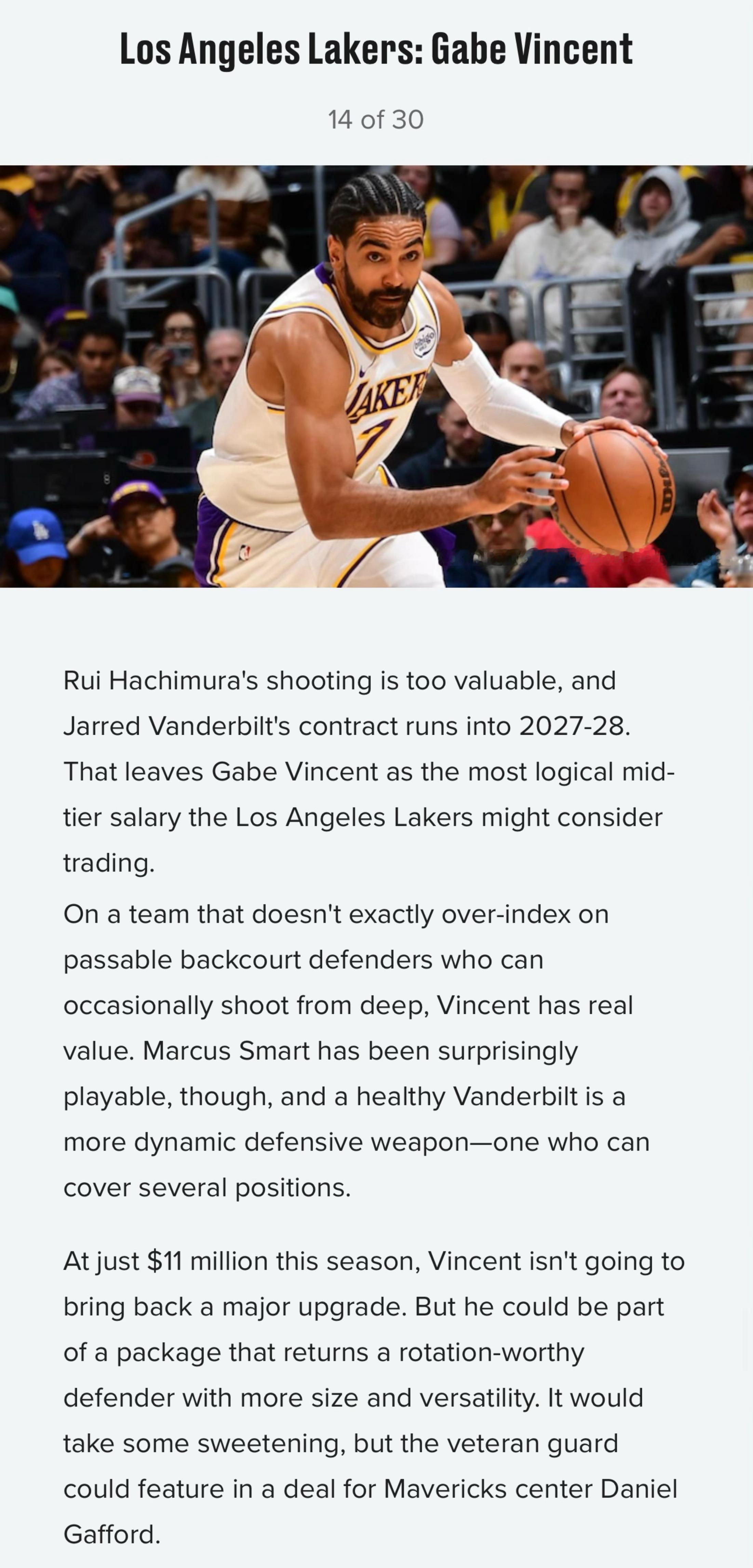 《露天看台》撰文预测联盟各队最可能交易的球员,湖人后卫文森特上榜,分析如下:八村塁的投篮能力极具价值,而范德比尔特的合同要到2028赛季结束才到期,这使得文森天成为湖人最有可能考虑交易的中等薪资球员。在这支并不盛产“能偶尔投三分的合格后场防守者”的球队里,文森特具备实际价值。不过斯玛特表现出人,健康的范德比尔特也是更具活力的防守大闸,他能防守多个位置。文森特本赛季薪资仅为1100万美元,交易他很难换来实力的大幅提升,但可以作为交易筹码的一部分,换来一名体型更出众、更全能的轮换级别防守球员。这笔交易需要湖人再加些添头。文森特有可能被纳入交易,用以换取独行侠中锋加福德。《露天看台》提到其他球队可能会交易的球员包括:特雷杨,赵四,三球,多森穆,贾莱特阿伦,加福德,勒韦尔,库明加,范弗利特,马瑟林,柯林斯,莫兰特,字母哥,兰德尔,特雷墨菲,哈腾施泰因,艾萨克,理查兹,罗威,基昂埃利斯,巴雷特,马尔卡宁。