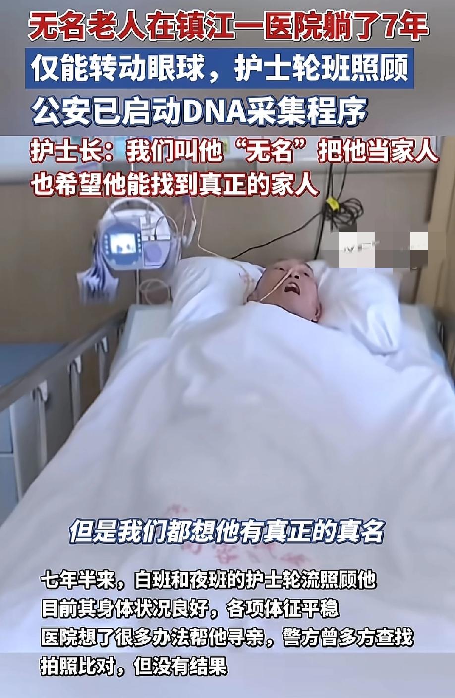 无名老人在路边晕倒,医院躺了7年,护士轮番照顾,因只能眼球转动,不能说话,所以一直找不到家人,目前警方已启动DNA采集对比。 护士虽说把他当家人一样照顾,但是还想找到他真正的家人。 还是好人多,老人遭遇不幸,但有这么多热心人的帮助,希望通过大家的努力能尽快让他回家。