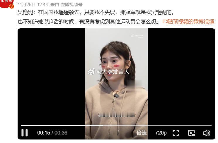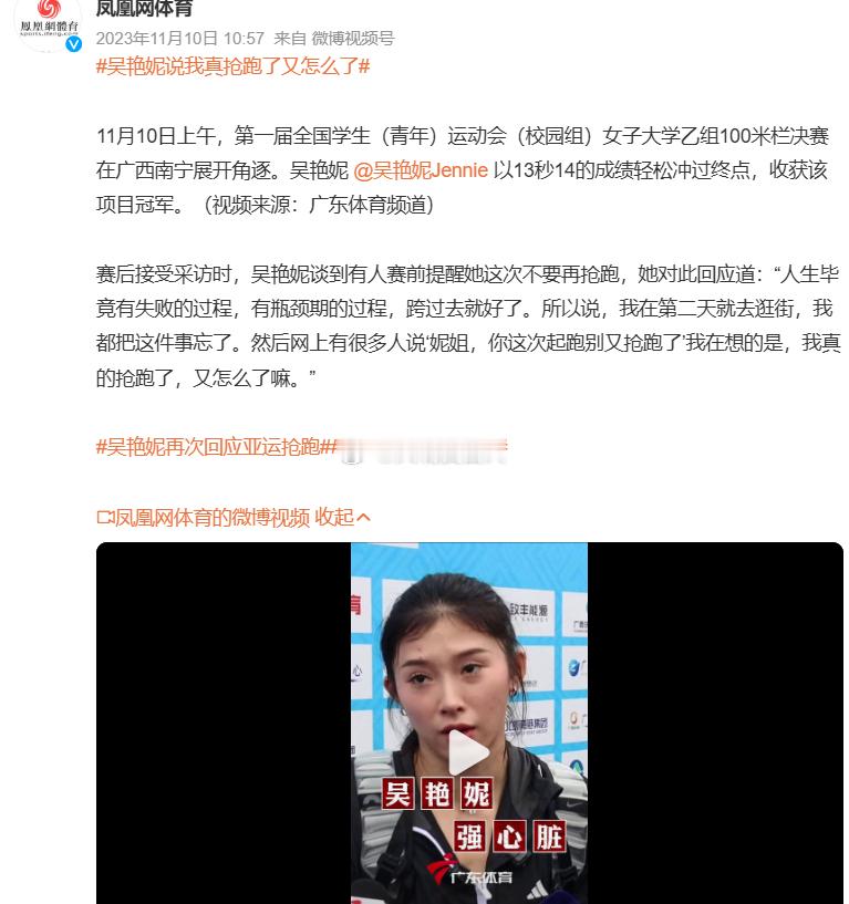 吴艳妮反问我哭咋了 搜索我的记忆,上一次2023年反问的是吴艳妮说我真抢跑了又怎么了(图2),还有今年上半年说的是,"在国内只要我不失误,冠军就是我吴艳妮的,在亚洲也是如此"(图3图4图5),看来这次全运会丢掉冠军,是自己失误了,便宜了冠军刘景扬了还有,2023年杭州亚运会,女子百米跨栏冠军是林雨薇(图8)赛后采访比赛风头被抢(图6)吴艳妮回应全运会摘银落泪,热点观点