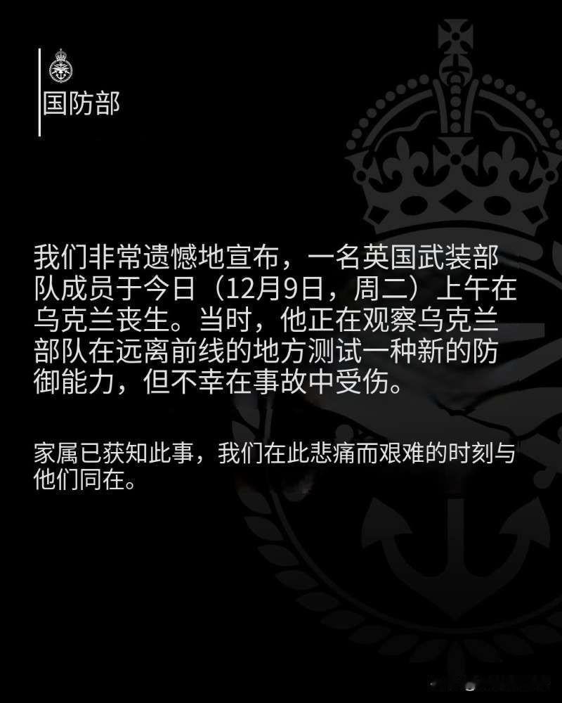 英国国防部发布声明称,12月9日,一名英国军人在乌克兰境内远离前线的地方观察乌军测试一种新型防御武器时发生事故,因伤身亡。 经证实,死者是一名28岁的英国精英伞兵团军人乔治·胡利。 值得注意的是,该团的第一营与其他三个营不同,隶属于英国特种部队支援小组。